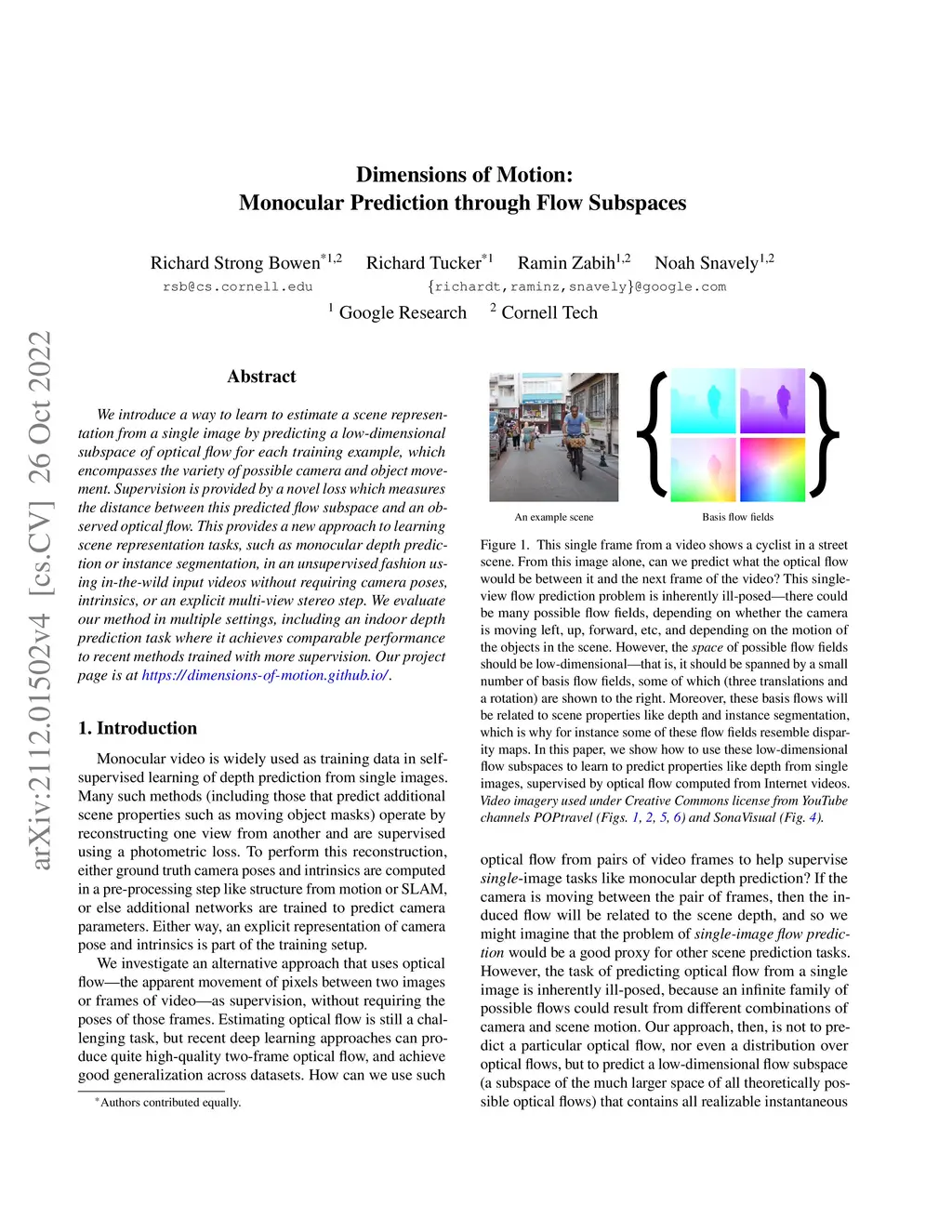 We introduce a way to learn to estimate a scene representation from a single image by predicting a low-dimensional subspace of optical flow for each training example, which encompasses the variety of possible camera and object movement. Supervision is provided by a novel loss which measures the distance between this predicted flow subspace and an observed optical flow. This provides a new approach to learning scene representation tasks, such as monocular depth prediction or instance segmentation, in an unsupervised fashion using in-the-wild input videos without requiring camera poses, intrinsics, or an explicit multi-view stereo step. We evaluate our method in multiple settings, including an indoor depth prediction task where it achieves comparable performance to recent methods trained with more supervision.
