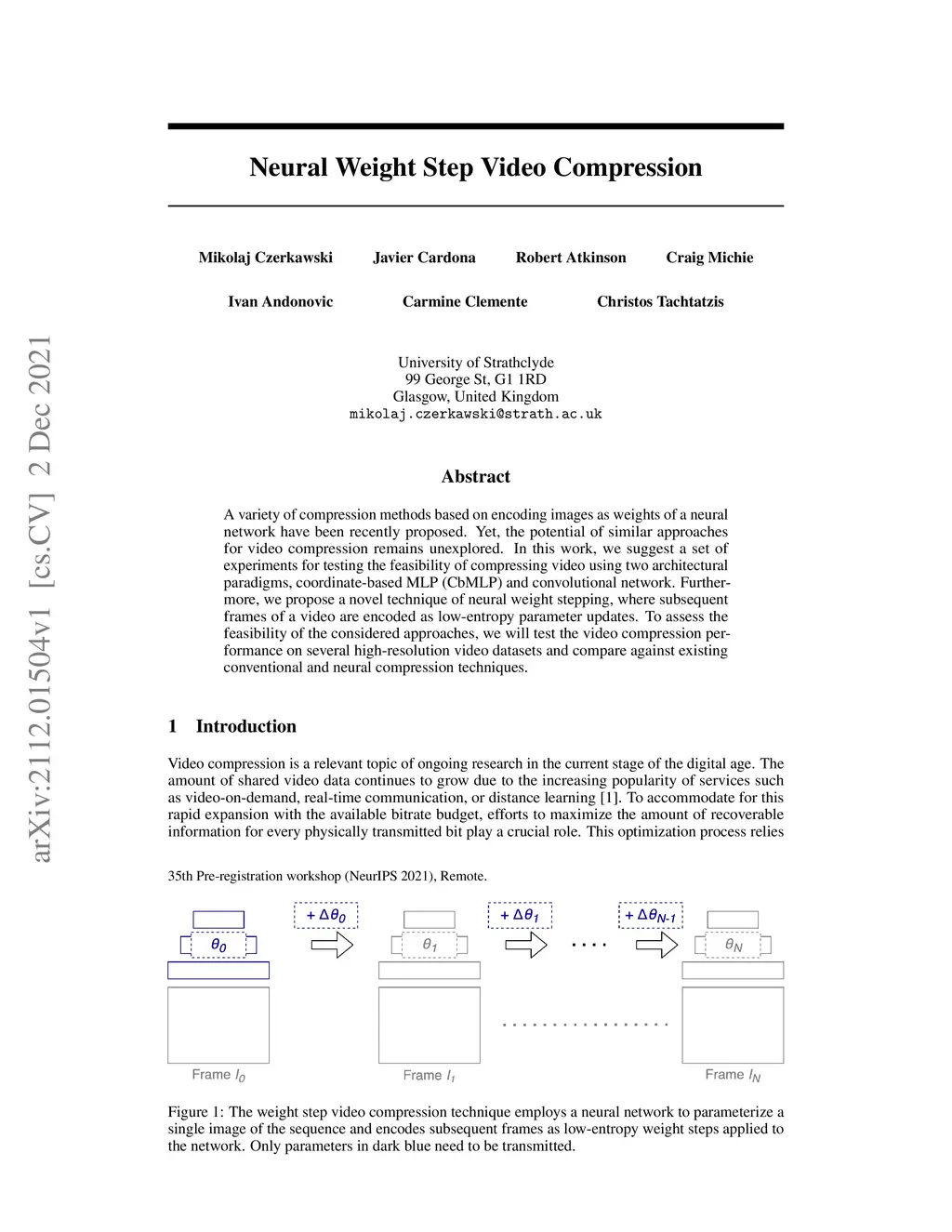 A variety of compression methods based on encoding images as weights of a neural network have been recently proposed. Yet, the potential of similar approaches for video compression remains unexplored. In this work, we suggest a set of experiments for testing the feasibility of compressing video using two architectural paradigms, coordinate-based MLP (CbMLP) and convolutional network. Furthermore, we propose a novel technique of neural weight stepping, where subsequent frames of a video are encoded as low-entropy parameter updates. To assess the feasibility of the considered approaches, we will test the video compression performance on several high-resolution video datasets and compare against existing conventional and neural compression techniques.