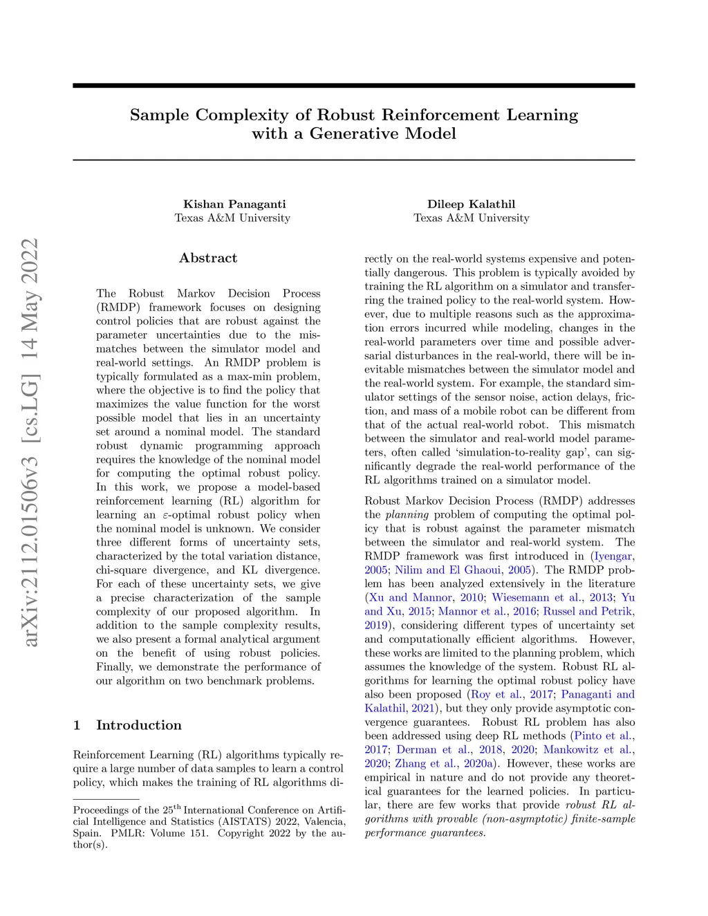 The Robust Markov Decision Process (RMDP) framework focuses on designing control policies that are robust against the parameter uncertainties due to the mismatches between the simulator model and real-world settings. An RMDP problem is typically formulated as a max-min problem, where the objective is to find the policy that maximizes the value function for the worst possible model that lies in an uncertainty set around a nominal model. The standard robust dynamic programming approach requires the knowledge of the nominal model for computing the optimal robust policy. In this work, we propose a model-based reinforcement learning (RL) algorithm for learning an -optimal robust policy when the nominal model is unknown. We consider three different forms of uncertainty sets, characterized by the total variation distance, chi-square divergence, and KL divergence. For each of these uncertainty sets, we give a precise characterization of the sample complexity of our proposed algorithm. In addition to the sample complexity results, we also present a formal analytical argument on the benefit of using robust policies. Finally, we demonstrate the performance of our algorithm on two benchmark problems.