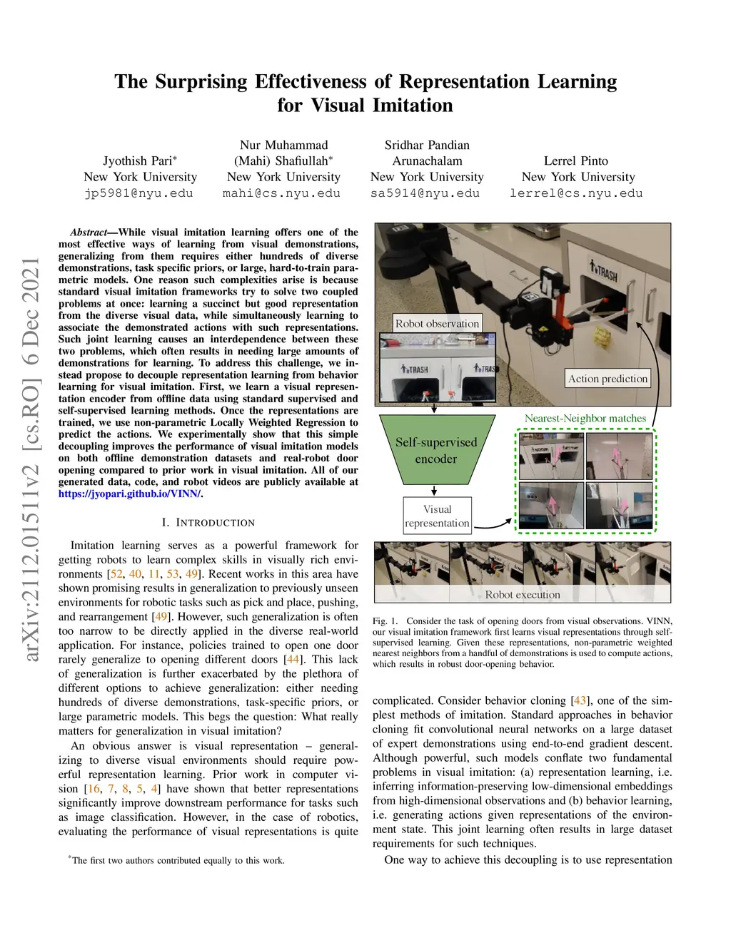 While visual imitation learning offers one of the most effective ways of learning from visual demonstrations, generalizing from them requires either hundreds of diverse demonstrations, task specific priors, or large, hard-to-train parametric models. One reason such complexities arise is because standard visual imitation frameworks try to solve two coupled problems at once: learning a succinct but good representation from the diverse visual data, while simultaneously learning to associate the demonstrated actions with such representations. Such joint learning causes an interdependence between these two problems, which often results in needing large amounts of demonstrations for learning. To address this challenge, we instead propose to decouple representation learning from behavior learning for visual imitation. First, we learn a visual representation encoder from offline data using standard supervised and self-supervised learning methods. Once the representations are trained, we use non-parametric Locally Weighted Regression to predict the actions. We experimentally show that this simple decoupling improves the performance of visual imitation models on both offline demonstration datasets and real-robot door opening compared to prior work in visual imitation. All of our generated data, code, and robot videos are publicly available at https://jyopari.github.io/VINN/.