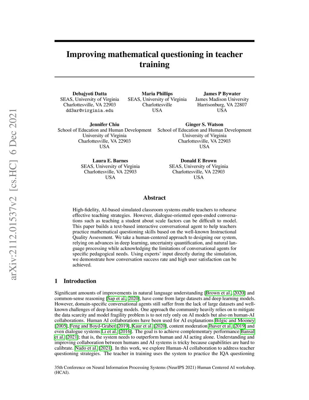 High-fidelity, AI-based simulated classroom systems enable teachers to rehearse effective teaching strategies. However, dialogue-oriented open-ended conversations such as teaching a student about scale factors can be difficult to model. This paper builds a text-based interactive conversational agent to help teachers practice mathematical questioning skills based on the well-known Instructional Quality Assessment. We take a human-centered approach to designing our system, relying on advances in deep learning, uncertainty quantification, and natural language processing while acknowledging the limitations of conversational agents for specific pedagogical needs. Using experts' input directly during the simulation, we demonstrate how conversation success rate and high user satisfaction can be achieved.