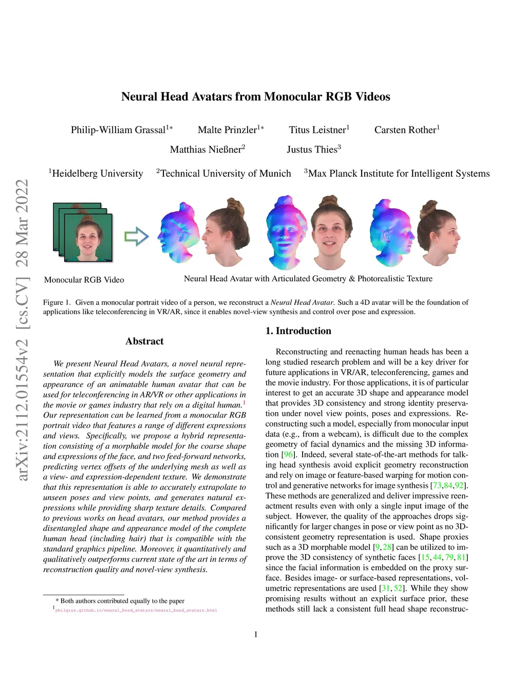 We present Neural Head Avatars, a novel neural representation that explicitly models the surface geometry and appearance of an animatable human avatar that can be used for teleconferencing in AR/VR or other applications in the movie or games industry that rely on a digital human. Our representation can be learned from a monocular RGB portrait video that features a range of different expressions and views. Specifically, we propose a hybrid representation consisting of a morphable model for the coarse shape and expressions of the face, and two feed-forward networks, predicting vertex offsets of the underlying mesh as well as a view- and expression-dependent texture. We demonstrate that this representation is able to accurately extrapolate to unseen poses and view points, and generates natural expressions while providing sharp texture details. Compared to previous works on head avatars, our method provides a disentangled shape and appearance model of the complete human head (including hair) that is compatible with the standard graphics pipeline. Moreover, it quantitatively and qualitatively outperforms current state of the art in terms of reconstruction quality and novel-view synthesis.