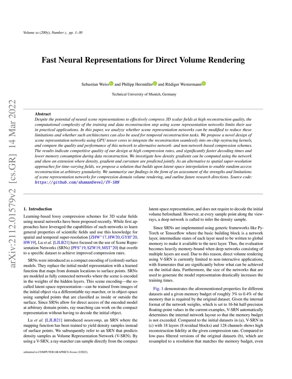 Despite the potential of neural scene representations to effectively compress 3D scalar fields at high reconstruction quality, the computational complexity of the training and data reconstruction step using scene representation networks limits their use in practical applications. In this paper, we analyze whether scene representation networks can be modified to reduce these limitations and whether such architectures can also be used for temporal reconstruction tasks. We propose a novel design of scene representation networks using GPU tensor cores to integrate the reconstruction seamlessly into on-chip raytracing kernels, and compare the quality and performance of this network to alternative network- and non-network-based compression schemes. The results indicate competitive quality of our design at high compression rates, and significantly faster decoding times and lower memory consumption during data reconstruction. We investigate how density gradients can be computed using the network and show an extension where density, gradient and curvature are predicted jointly. As an alternative to spatial super-resolution approaches for time-varying fields, we propose a solution that builds upon latent-space interpolation to enable random access reconstruction at arbitrary granularity. We summarize our findings in the form of an assessment of the strengths and limitations of scene representation networks \changed{for compression domain volume rendering, and outline future research directions.