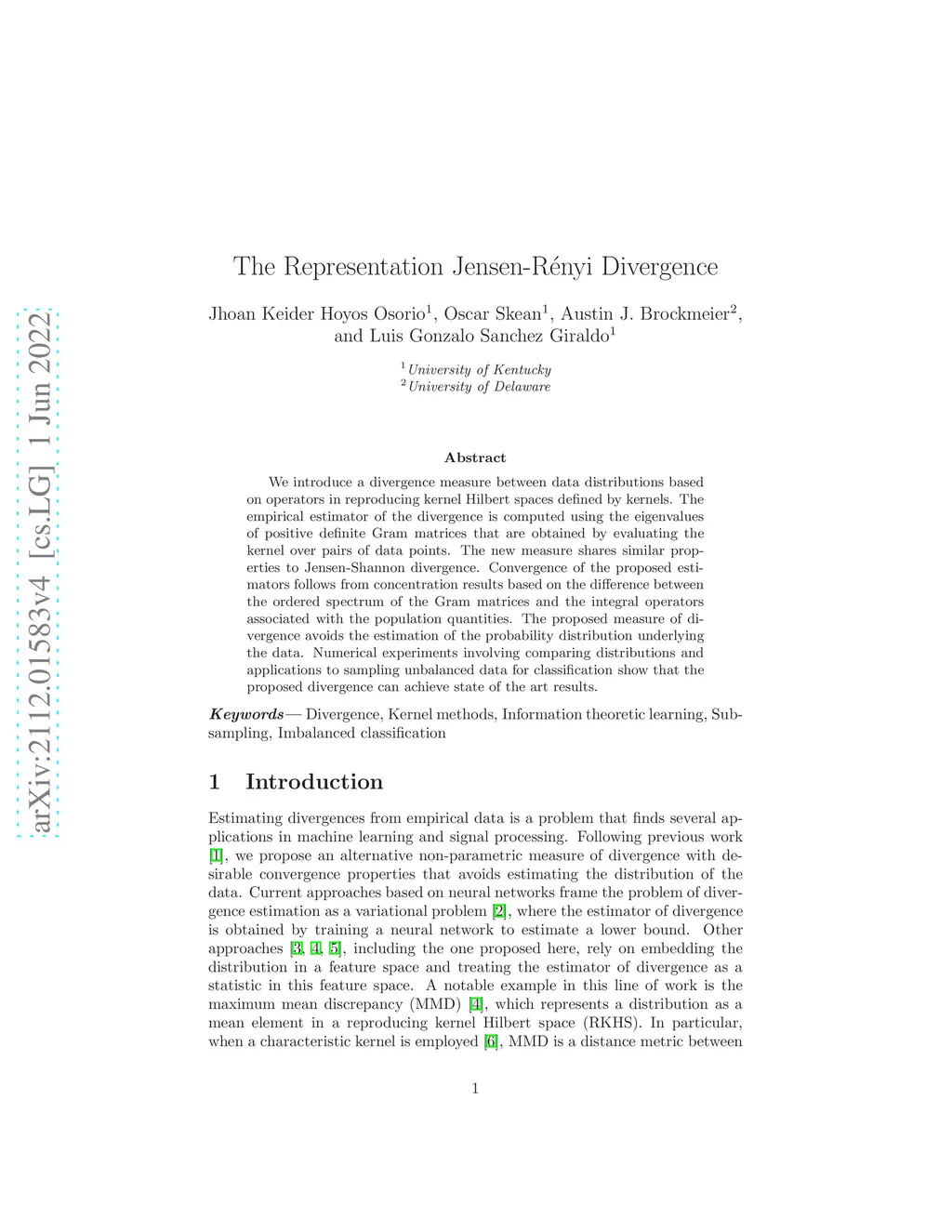 We introduce a divergence measure between data distributions based on operators in reproducing kernel Hilbert spaces defined by kernels. The empirical estimator of the divergence is computed using the eigenvalues of positive definite Gram matrices that are obtained by evaluating the kernel over pairs of data points. The new measure shares similar properties to Jensen-Shannon divergence. Convergence of the proposed estimators follows from concentration results based on the difference between the ordered spectrum of the Gram matrices and the integral operators associated with the population quantities. The proposed measure of divergence avoids the estimation of the probability distribution underlying the data. Numerical experiments involving comparing distributions and applications to sampling unbalanced data for classification show that the proposed divergence can achieve state of the art results.