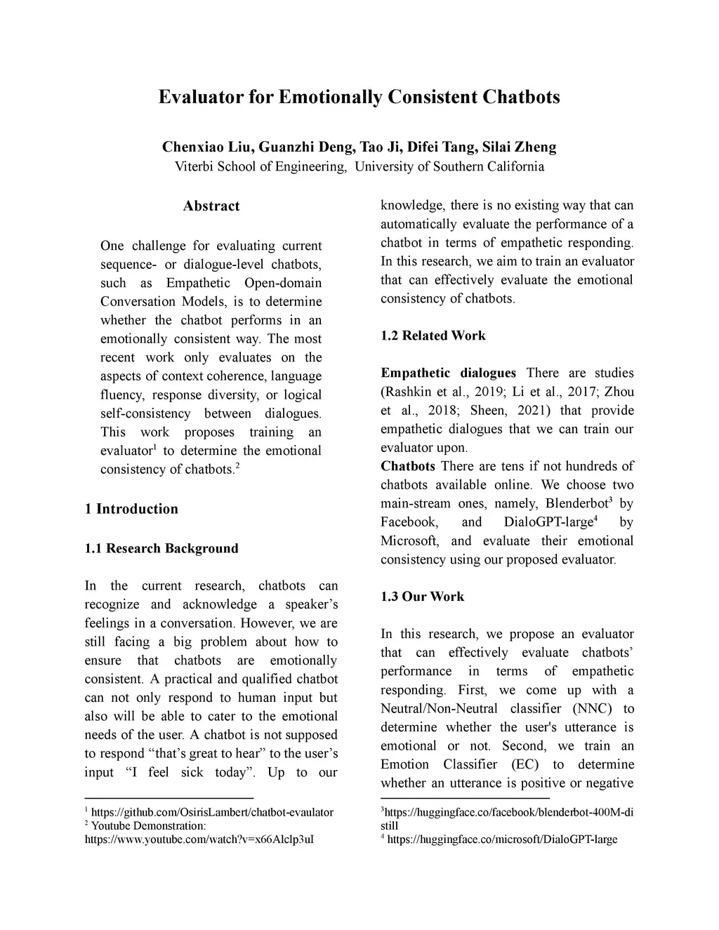 One challenge for evaluating current sequence- or dialogue-level chatbots, such as Empathetic Open-domain Conversation Models, is to determine whether the chatbot performs in an emotionally consistent way. The most recent work only evaluates on the aspects of context coherence, language fluency, response diversity, or logical self-consistency between dialogues. This work proposes training an evaluator to determine the emotional consistency of chatbots.