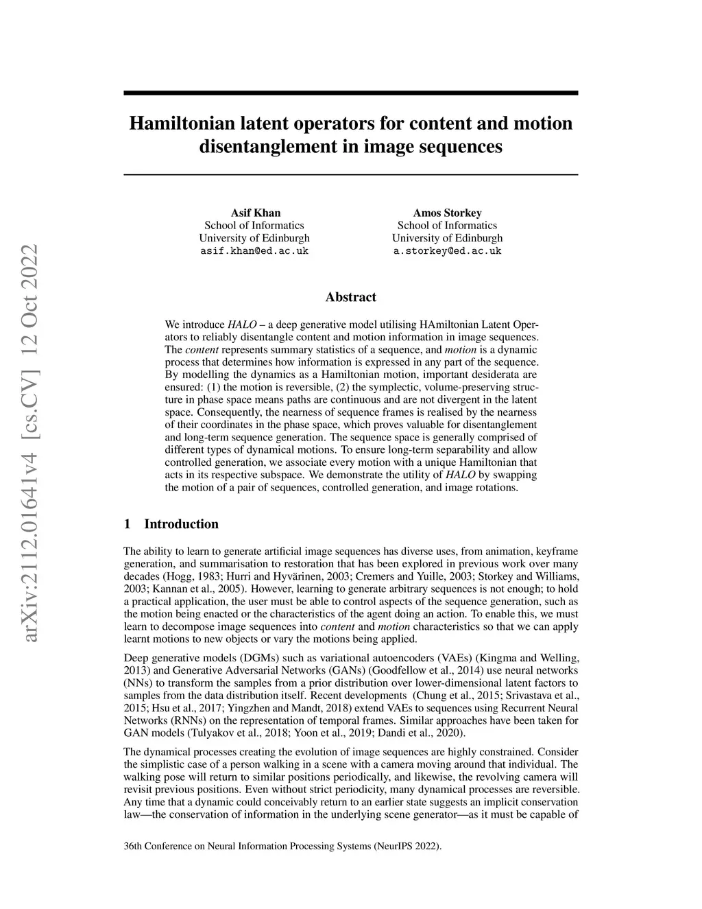 We introduce \textit{HALO} -- a deep generative model utilising HAmiltonian Latent Operators to reliably disentangle content and motion information in image sequences. The \textit{content} represents summary statistics of a sequence, and \textit{motion} is a dynamic process that determines how information is expressed in any part of the sequence. By modelling the dynamics as a Hamiltonian motion, important desiderata are ensured: (1) the motion is reversible, (2) the symplectic, volume-preserving structure in phase space means paths are continuous and are not divergent in the latent space. Consequently, the nearness of sequence frames is realised by the nearness of their coordinates in the phase space, which proves valuable for disentanglement and long-term sequence generation. The sequence space is generally comprised of different types of dynamical motions. To ensure long-term separability and allow controlled generation, we associate every motion with a unique Hamiltonian that acts in its respective subspace. We demonstrate the utility of \textit{HALO} by swapping the motion of a pair of sequences, controlled generation, and image rotations.