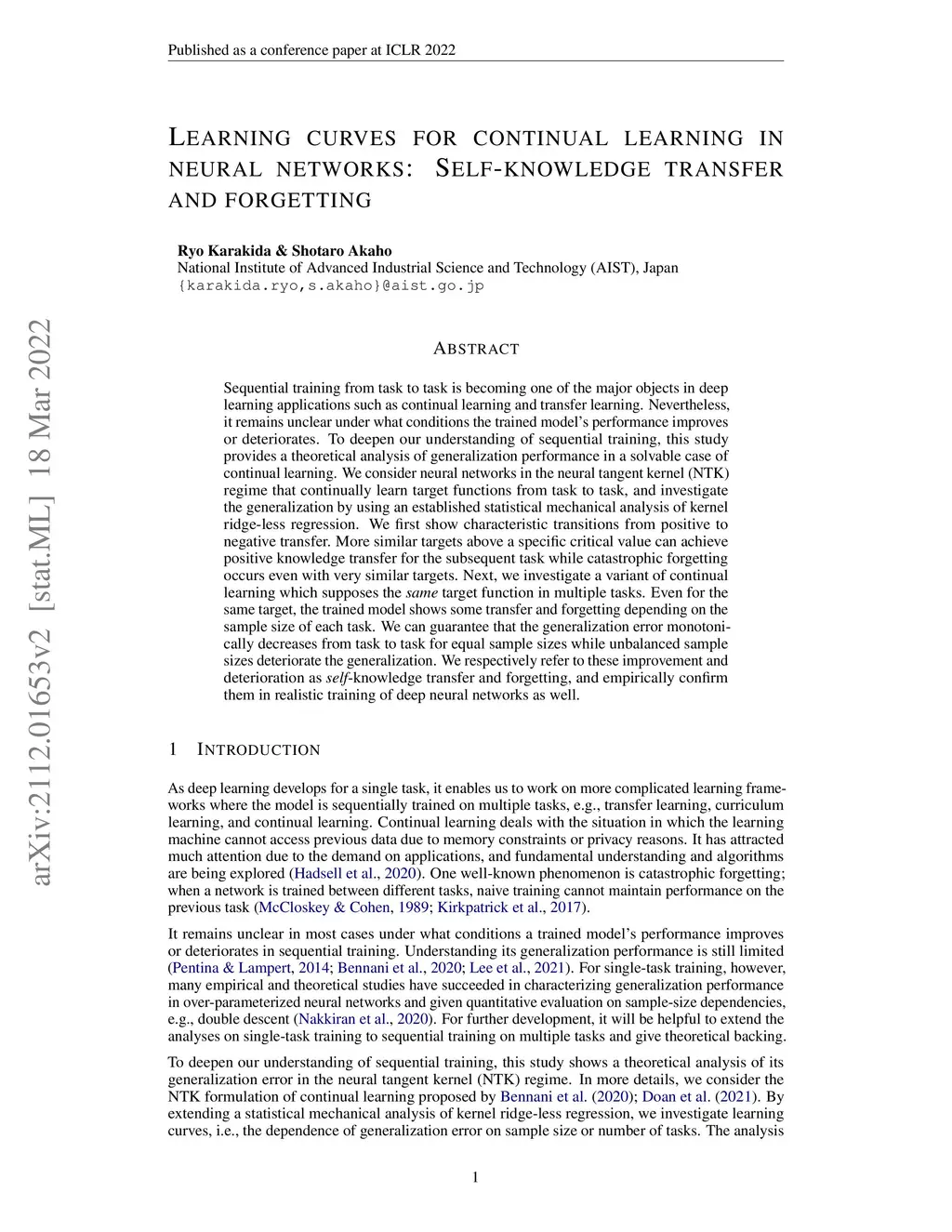 Sequential training from task to task is becoming one of the major objects in deep learning applications such as continual learning and transfer learning. Nevertheless, it remains unclear under what conditions the trained model's performance improves or deteriorates. To deepen our understanding of sequential training, this study provides a theoretical analysis of generalization performance in a solvable case of continual learning. We consider neural networks in the neural tangent kernel (NTK) regime that continually learn target functions from task to task, and investigate the generalization by using an established statistical mechanical analysis of kernel ridge-less regression. We first show characteristic transitions from positive to negative transfer. More similar targets above a specific critical value can achieve positive knowledge transfer for the subsequent task while catastrophic forgetting occurs even with very similar targets. Next, we investigate a variant of continual learning which supposes the same target function in multiple tasks. Even for the same target, the trained model shows some transfer and forgetting depending on the sample size of each task. We can guarantee that the generalization error monotonically decreases from task to task for equal sample sizes while unbalanced sample sizes deteriorate the generalization. We respectively refer to these improvement and deterioration as self-knowledge transfer and forgetting, and empirically confirm them in realistic training of deep neural networks as well.