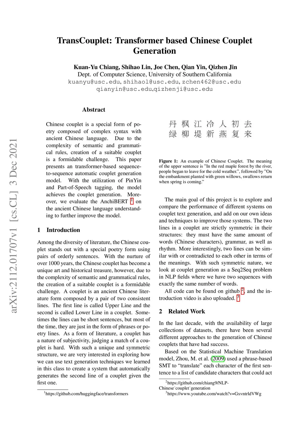 Chinese couplet is a special form of poetry composed of complex syntax with ancient Chinese language. Due to the complexity of semantic and grammatical rules, creation of a suitable couplet is a formidable challenge. This paper presents a transformer-based sequence-to-sequence couplet generation model. With the utilization of AnchiBERT, the model is able to capture ancient Chinese language understanding. Moreover, we evaluate the Glyph, PinYin and Part-of-Speech tagging on the couplet grammatical rules to further improve the model.