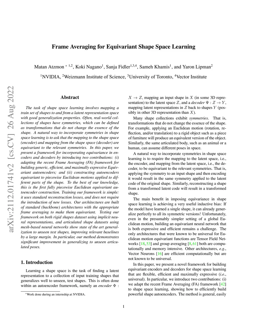 Frame Averaging for Equivariant Shape Space Learning
