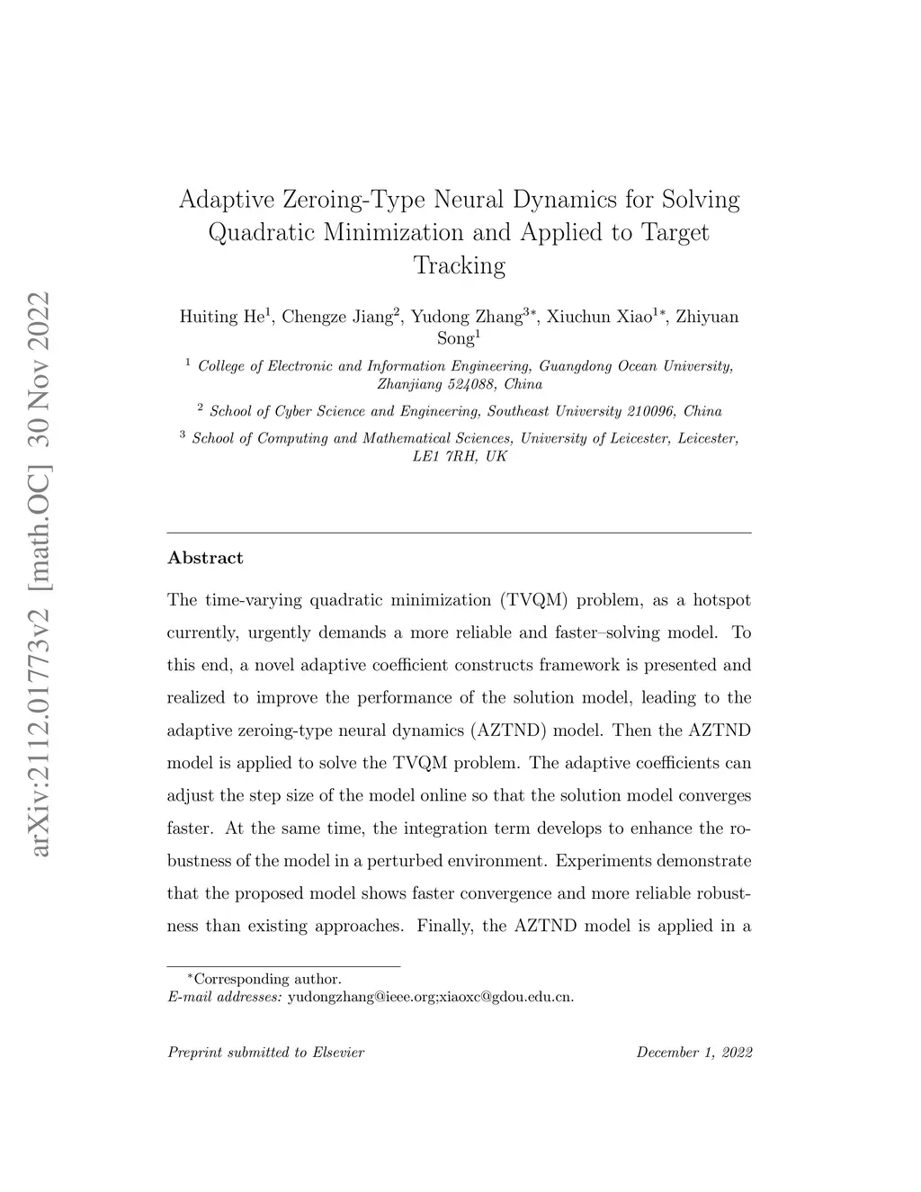 The time-varying quadratic miniaturization (TVQM) problem, as a hotspot currently, urgently demands a more reliable and faster--solving model. To this end, a novel adaptive coefficient constructs framework is presented and realized to improve the performance of the solution model, leading to the adaptive zeroing-type neural dynamics (AZTND) model. Then the AZTND model is applied to solve the TVQM problem. The adaptive coefficients can adjust the step size of the model online so that the solution model converges faster. At the same time, the integration term develops to enhance the robustness of the model in a perturbed environment. Experiments demonstrate that the proposed model shows faster convergence and more reliable robustness than existing approaches. Finally, the AZTND model is applied in a target tracking scheme, proving the practicality of our proposed model.