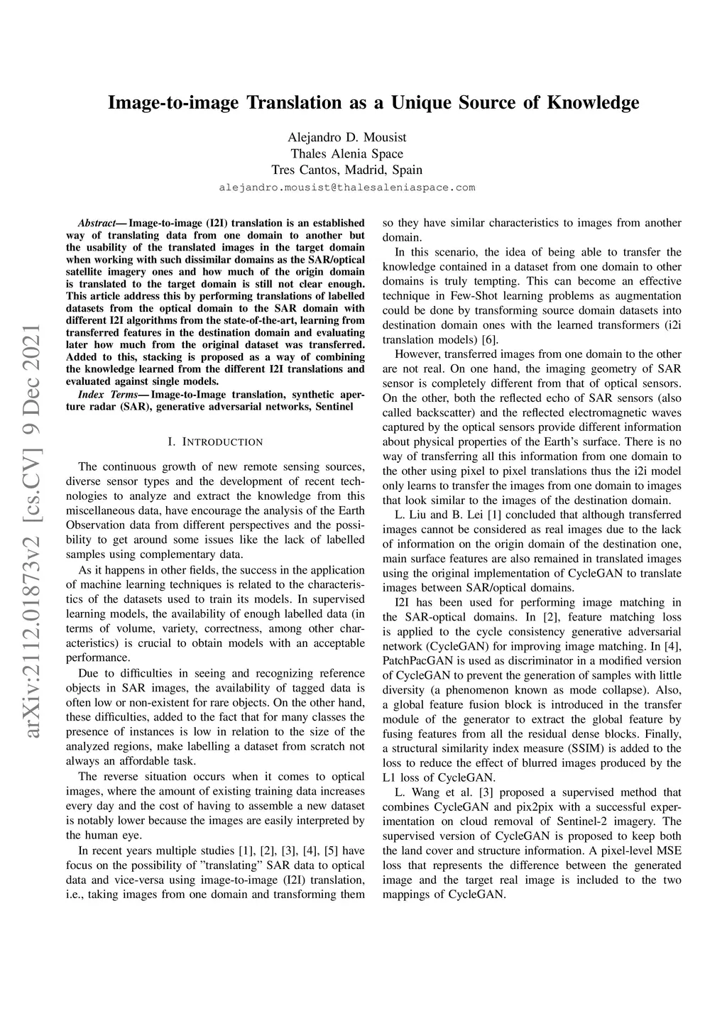 Image-to-image (I2I) translation is an established way of translating data from one domain to another but the usability of the translated images in the target domain when working with such dissimilar domains as the SAR/optical satellite imagery ones and how much of the origin domain is translated to the target domain is still not clear enough. This article address this by performing translations of labelled datasets from the optical domain to the SAR domain with different I2I algorithms from the state-of-the-art, learning from transferred features in the destination domain and evaluating later how much from the original dataset was transferred. Added to this, stacking is proposed as a way of combining the knowledge learned from the different I2I translations and evaluated against single models.