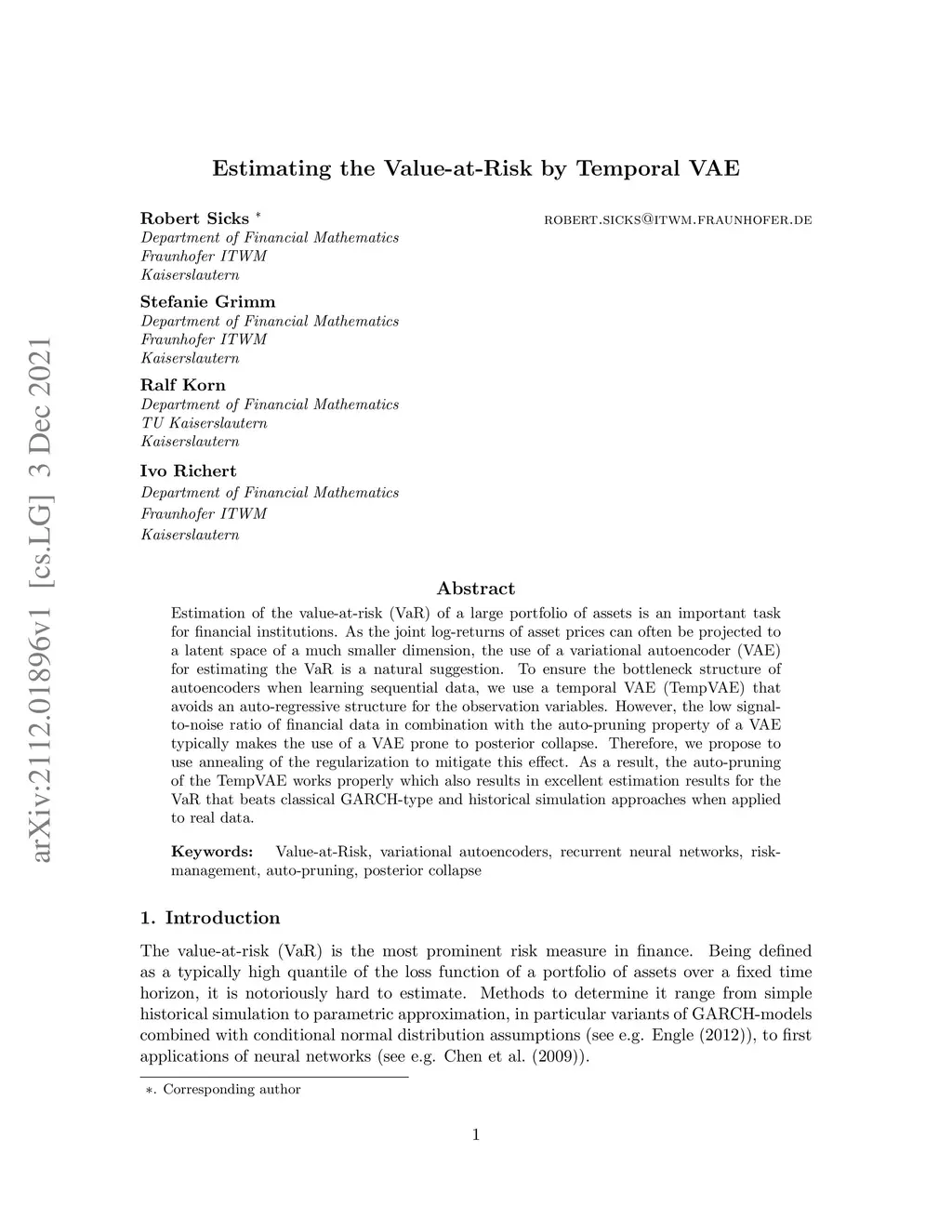 Estimation of the value-at-risk (VaR) of a large portfolio of assets is an important task for financial institutions. As the joint log-returns of asset prices can often be projected to a latent space of a much smaller dimension, the use of a variational autoencoder (VAE) for estimating the VaR is a natural suggestion. To ensure the bottleneck structure of autoencoders when learning sequential data, we use a temporal VAE (TempVAE) that avoids an auto-regressive structure for the observation variables. However, the low signal- to-noise ratio of financial data in combination with the auto-pruning property of a VAE typically makes the use of a VAE prone to posterior collapse. Therefore, we propose to use annealing of the regularization to mitigate this effect. As a result, the auto-pruning of the TempVAE works properly which also results in excellent estimation results for the VaR that beats classical GARCH-type and historical simulation approaches when applied to real data.
