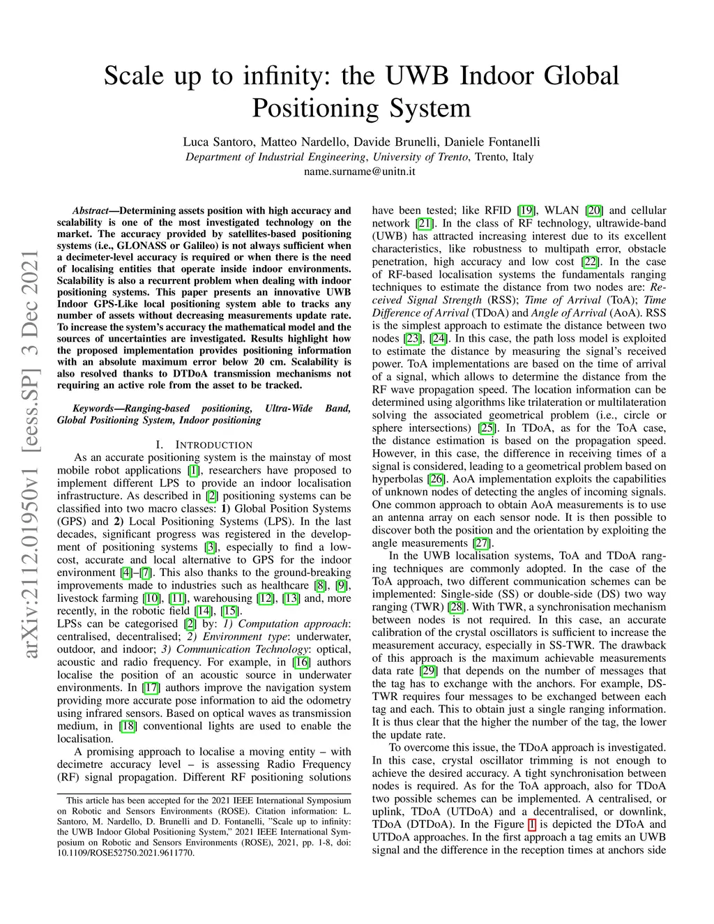 Determining assets position with high accuracy and scalability is one of the most investigated technology on the market. The accuracy provided by satellites-based positioning systems (i.e., GLONASS or Galileo) is not always sufficient when a decimeter-level accuracy is required or when there is the need of localising entities that operate inside indoor environments. Scalability is also a recurrent problem when dealing with indoor positioning systems. This paper presents an innovative UWB Indoor GPS-Like local positioning system able to tracks any number of assets without decreasing measurements update rate. To increase the system's accuracy the mathematical model and the sources of uncertainties are investigated. Results highlight how the proposed implementation provides positioning information with an absolute maximum error below 20 cm. Scalability is also resolved thanks to DTDoA transmission mechanisms not requiring an active role from the asset to be tracked.
