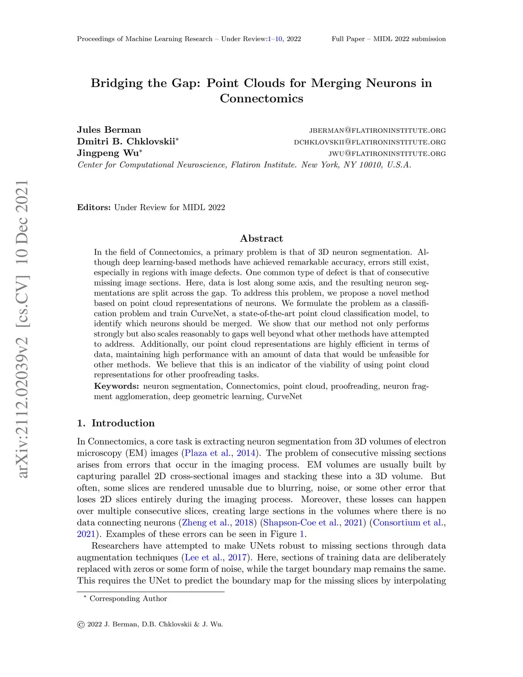 Bridging the Gap: Point Clouds for Merging Neurons in Connectomics