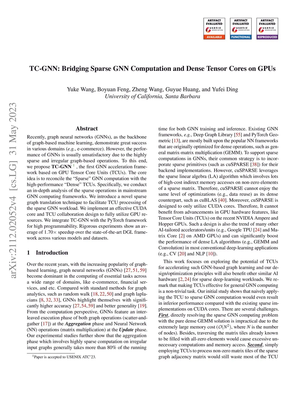 TC-GNN: Bridging Sparse GNN Computation and Dense Tensor Cores on GPUs
