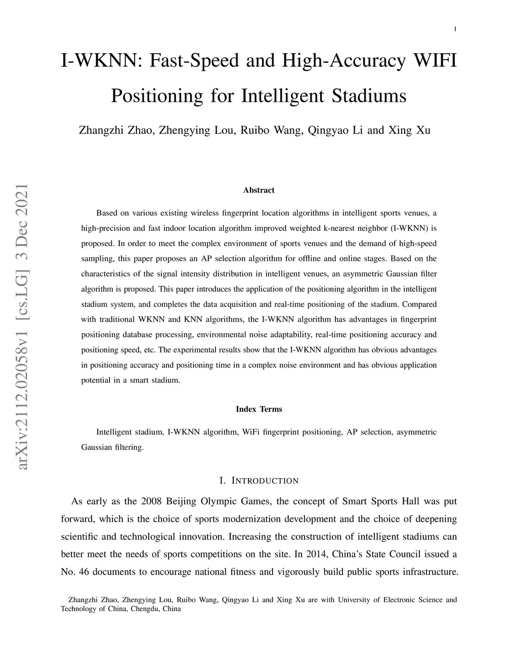 Based on various existing wireless fingerprint location algorithms in intelligent sports venues, a high-precision and fast indoor location algorithm improved weighted k-nearest neighbor (I-WKNN) is proposed. In order to meet the complex environment of sports venues and the demand of high-speed sampling, this paper proposes an AP selection algorithm for offline and online stages. Based on the characteristics of the signal intensity distribution in intelligent venues, an asymmetric Gaussian filter algorithm is proposed. This paper introduces the application of the positioning algorithm in the intelligent stadium system, and completes the data acquisition and real-time positioning of the stadium. Compared with traditional WKNN and KNN algorithms, the I-WKNN algorithm has advantages in fingerprint positioning database processing, environmental noise adaptability, real-time positioning accuracy and positioning speed, etc. The experimental results show that the I-WKNN algorithm has obvious advantages in positioning accuracy and positioning time in a complex noise environment and has obvious application potential in a smart stadium.