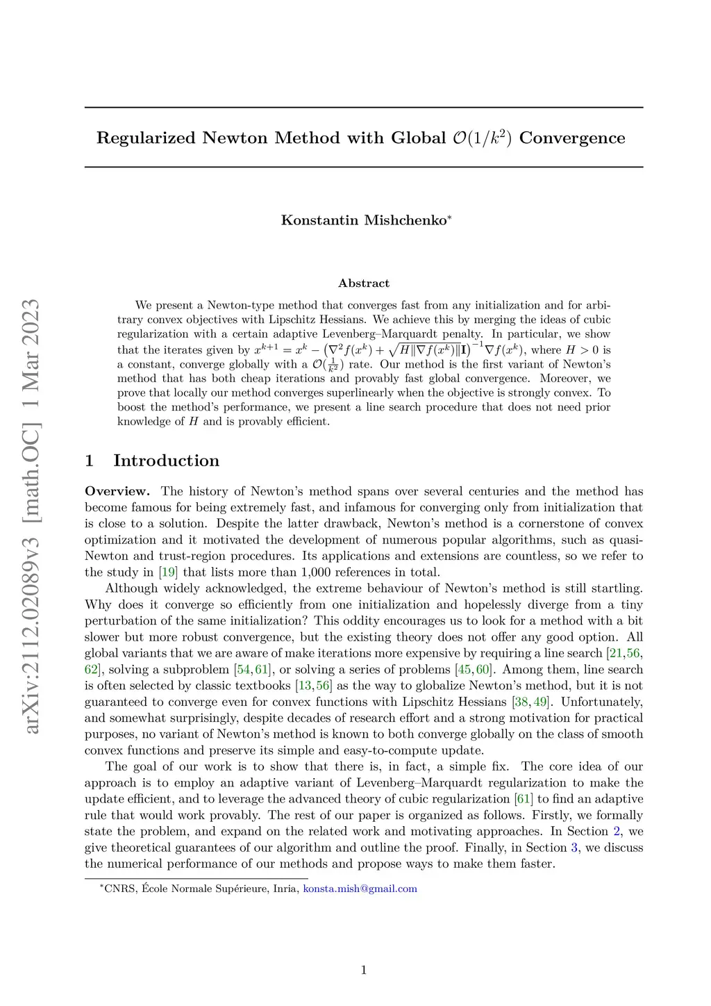 We present a Newton-type method that converges fast from any initialization and for arbitrary convex objectives with Lipschitz Hessians. We achieve this by merging the ideas of cubic regularization with a certain adaptive Levenberg--Marquardt penalty. In particular, we show that the iterates given by , where is a constant, converge globally with a rate. Our method is the first variant of Newton's method that has both cheap iterations and provably fast global convergence. Moreover, we prove that locally our method converges superlinearly when the objective is strongly convex. To boost the method's performance, we present a line search procedure that does not need prior knowledge of and is provably efficient.