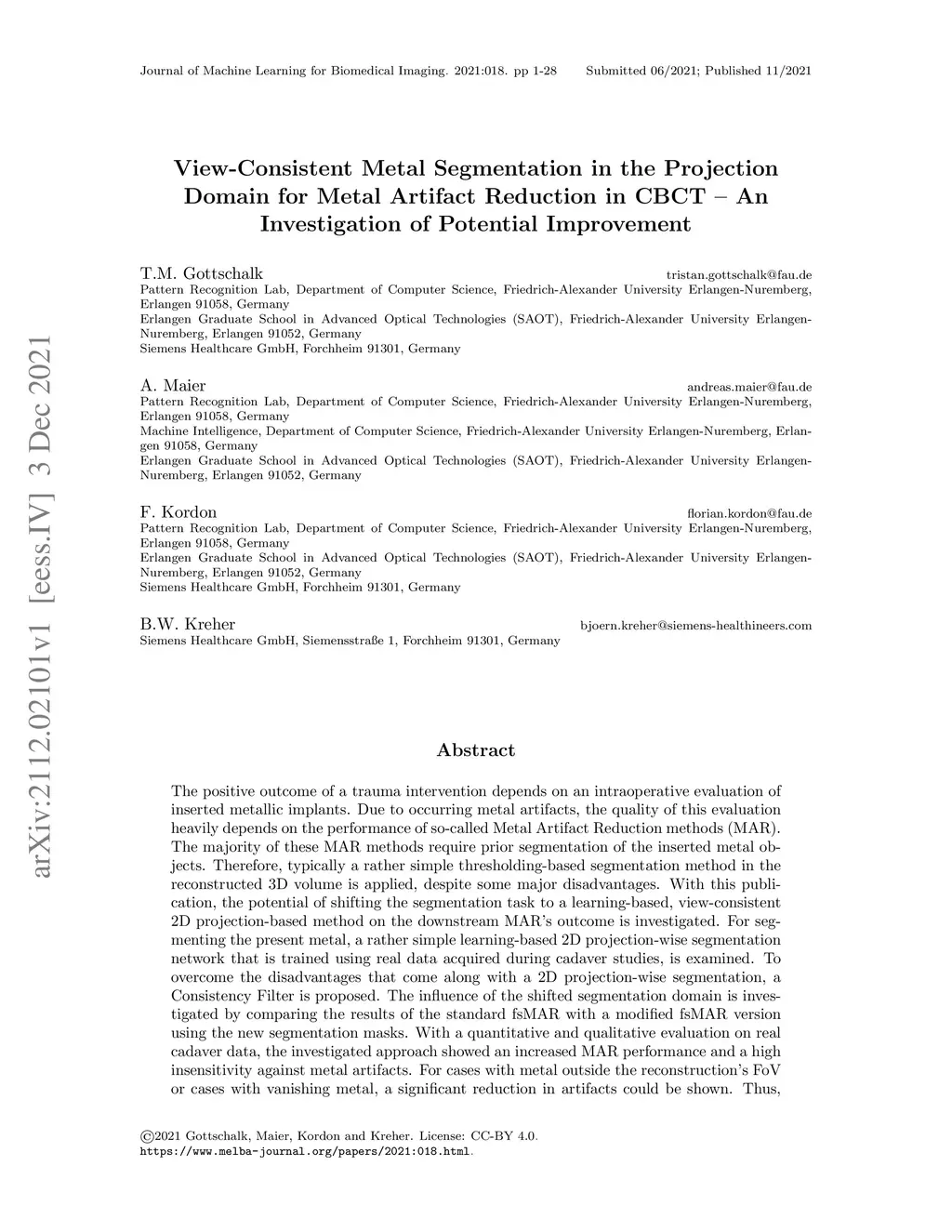 The positive outcome of a trauma intervention depends on an intraoperative evaluation of inserted metallic implants. Due to occurring metal artifacts, the quality of this evaluation heavily depends on the performance of so-called Metal Artifact Reduction methods (MAR). The majority of these MAR methods require prior segmentation of the inserted metal objects. Therefore, typically a rather simple thresholding-based segmentation method in the reconstructed 3D volume is applied, despite some major disadvantages. With this publication, the potential of shifting the segmentation task to a learning-based, view-consistent 2D projection-based method on the downstream MAR's outcome is investigated. For segmenting the present metal, a rather simple learning-based 2D projection-wise segmentation network that is trained using real data acquired during cadaver studies, is examined. To overcome the disadvantages that come along with a 2D projection-wise segmentation, a Consistency Filter is proposed. The influence of the shifted segmentation domain is investigated by comparing the results of the standard fsMAR with a modified fsMAR version using the new segmentation masks. With a quantitative and qualitative evaluation on real cadaver data, the investigated approach showed an increased MAR performance and a high insensitivity against metal artifacts. For cases with metal outside the reconstruction's FoV or cases with vanishing metal, a significant reduction in artifacts could be shown. Thus, increases of up to roughly 3 dB w.r.t. the mean PSNR metric over all slices and up to 9 dB for single slices were achieved. The shown results reveal a beneficial influence of the shift to a 2D-based segmentation method on real data for downstream use with a MAR method, like the fsMAR.