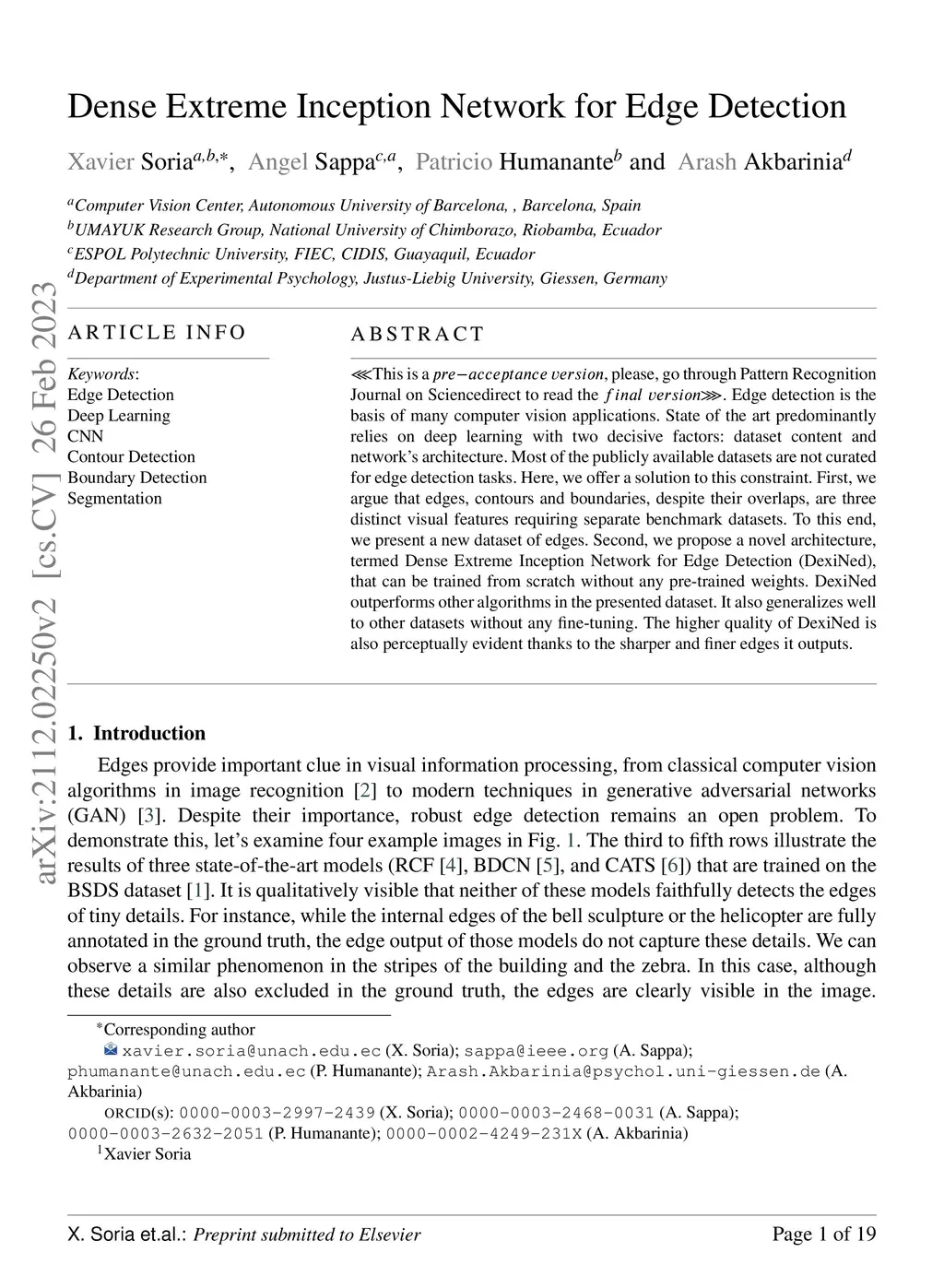 <<<This is a pre-acceptance version, please, go through Pattern Recognition Journal on Sciencedirect to read the final version>>>. Edge detection is the basis of many computer vision applications. State of the art predominantly relies on deep learning with two decisive factors: dataset content and network's architecture. Most of the publicly available datasets are not curated for edge detection tasks. Here, we offer a solution to this constraint. First, we argue that edges, contours and boundaries, despite their overlaps, are three distinct visual features requiring separate benchmark datasets. To this end, we present a new dataset of edges. Second, we propose a novel architecture, termed Dense Extreme Inception Network for Edge Detection (DexiNed), that can be trained from scratch without any pre-trained weights. DexiNed outperforms other algorithms in the presented dataset. It also generalizes well to other datasets without any fine-tuning. The higher quality of DexiNed is also perceptually evident thanks to the sharper and finer edges it outputs.
