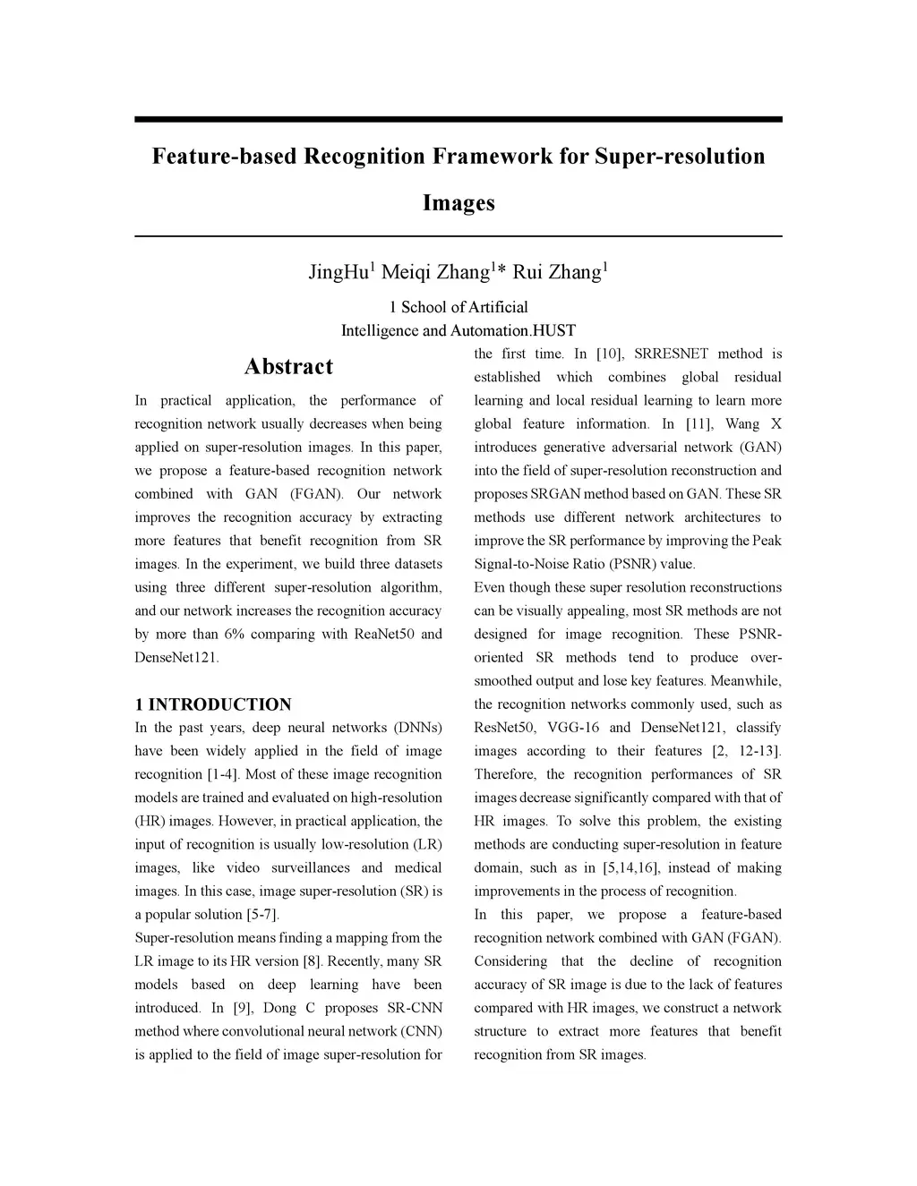 In practical application, the performance of recognition network usually decreases when being applied on super-resolution images. In this paper, we propose a feature-based recognition network combined with GAN (FGAN). Our network improves the recognition accuracy by extracting more features that benefit recognition from SR images. In the experiment, we build three datasets using three different super-resolution algorithm, and our network increases the recognition accuracy by more than 6% comparing with ReaNet50 and DenseNet121.