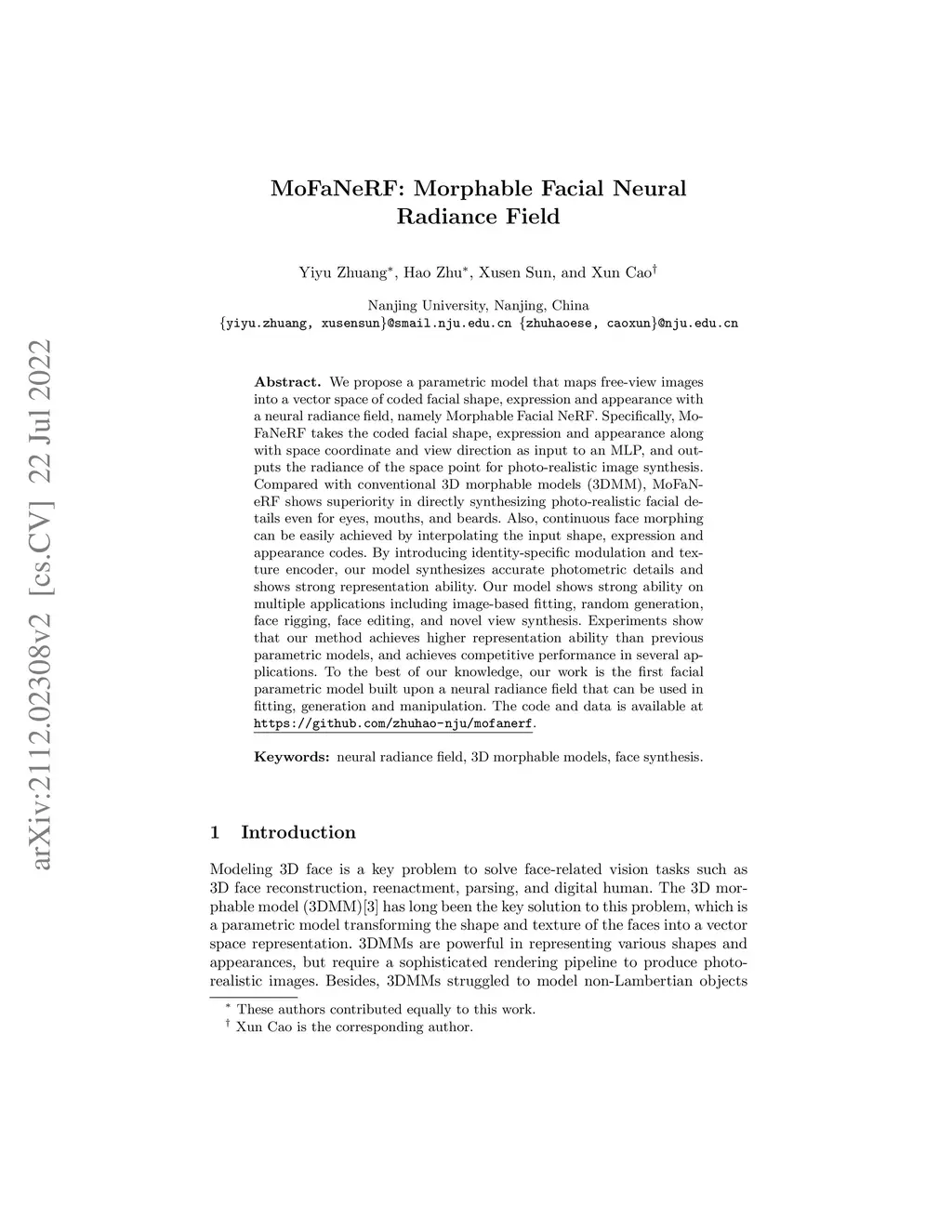 We propose a parametric model that maps free-view images into a vector space of coded facial shape, expression and appearance with a neural radiance field, namely Morphable Facial NeRF. Specifically, MoFaNeRF takes the coded facial shape, expression and appearance along with space coordinate and view direction as input to an MLP, and outputs the radiance of the space point for photo-realistic image synthesis. Compared with conventional 3D morphable models (3DMM), MoFaNeRF shows superiority in directly synthesizing photo-realistic facial details even for eyes, mouths, and beards. Also, continuous face morphing can be easily achieved by interpolating the input shape, expression and appearance codes. By introducing identity-specific modulation and texture encoder, our model synthesizes accurate photometric details and shows strong representation ability. Our model shows strong ability on multiple applications including image-based fitting, random generation, face rigging, face editing, and novel view synthesis. Experiments show that our method achieves higher representation ability than previous parametric models, and achieves competitive performance in several applications. To the best of our knowledge, our work is the first facial parametric model built upon a neural radiance field that can be used in fitting, generation and manipulation. The code and data is available at https://github.com/zhuhao-nju/mofanerf.