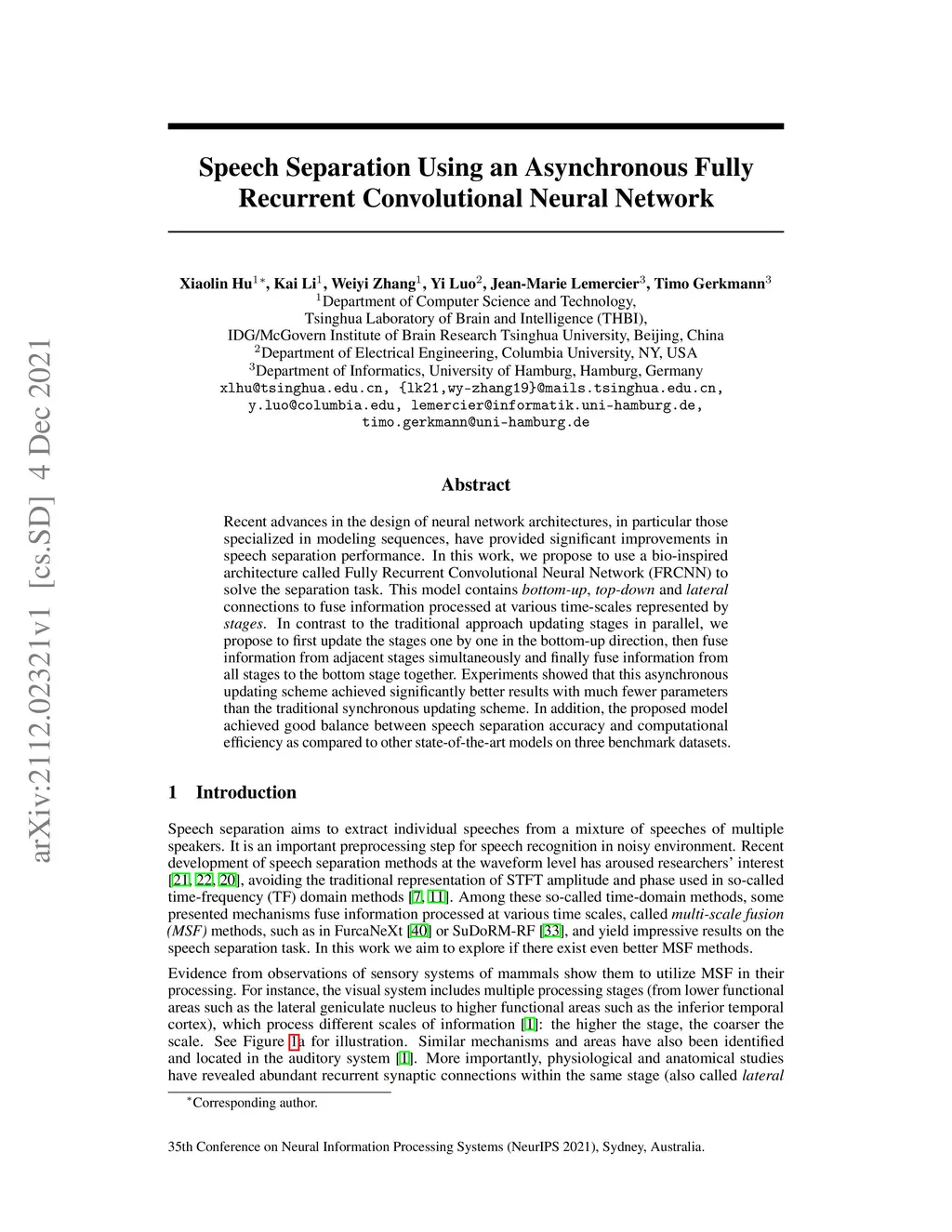 Recent advances in the design of neural network architectures, in particular those specialized in modeling sequences, have provided significant improvements in speech separation performance. In this work, we propose to use a bio-inspired architecture called Fully Recurrent Convolutional Neural Network (FRCNN) to solve the separation task. This model contains bottom-up, top-down and lateral connections to fuse information processed at various time-scales represented by \textit{stages}. In contrast to the traditional approach updating stages in parallel, we propose to first update the stages one by one in the bottom-up direction, then fuse information from adjacent stages simultaneously and finally fuse information from all stages to the bottom stage together. Experiments showed that this asynchronous updating scheme achieved significantly better results with much fewer parameters than the traditional synchronous updating scheme. In addition, the proposed model achieved good balance between speech separation accuracy and computational efficiency as compared to other state-of-the-art models on three benchmark datasets.