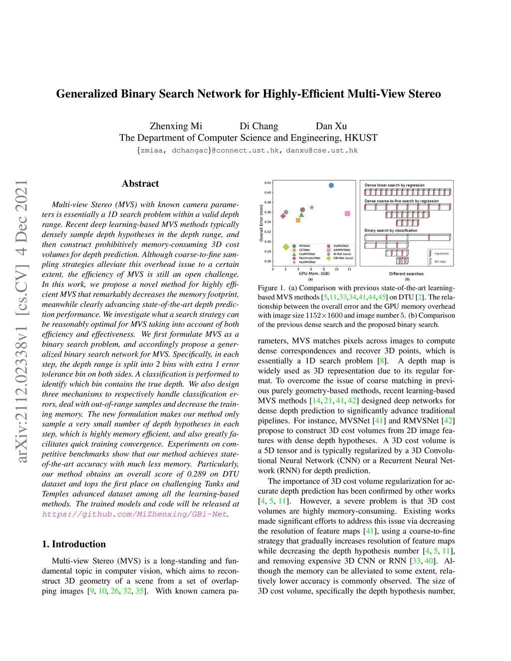 Multi-view Stereo (MVS) with known camera parameters is essentially a 1D search problem within a valid depth range. Recent deep learning-based MVS methods typically densely sample depth hypotheses in the depth range, and then construct prohibitively memory-consuming 3D cost volumes for depth prediction. Although coarse-to-fine sampling strategies alleviate this overhead issue to a certain extent, the efficiency of MVS is still an open challenge. In this work, we propose a novel method for highly efficient MVS that remarkably decreases the memory footprint, meanwhile clearly advancing state-of-the-art depth prediction performance. We investigate what a search strategy can be reasonably optimal for MVS taking into account of both efficiency and effectiveness. We first formulate MVS as a binary search problem, and accordingly propose a generalized binary search network for MVS. Specifically, in each step, the depth range is split into 2 bins with extra 1 error tolerance bin on both sides. A classification is performed to identify which bin contains the true depth. We also design three mechanisms to respectively handle classification errors, deal with out-of-range samples and decrease the training memory. The new formulation makes our method only sample a very small number of depth hypotheses in each step, which is highly memory efficient, and also greatly facilitates quick training convergence. Experiments on competitive benchmarks show that our method achieves state-of-the-art accuracy with much less memory. Particularly, our method obtains an overall score of 0.289 on DTU dataset and tops the first place on challenging Tanks and Temples advanced dataset among all the learning-based methods. The trained models and code will be released at https://github.com/MiZhenxing/GBi-Net.