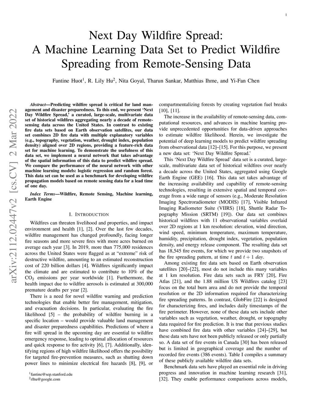 Predicting wildfire spread is critical for land management and disaster preparedness. To this end, we present `Next Day Wildfire Spread,' a curated, large-scale, multivariate data set of historical wildfires aggregating nearly a decade of remote-sensing data across the United States. In contrast to existing fire data sets based on Earth observation satellites, our data set combines 2D fire data with multiple explanatory variables (e.g., topography, vegetation, weather, drought index, population density) aligned over 2D regions, providing a feature-rich data set for machine learning. To demonstrate the usefulness of this data set, we implement a neural network that takes advantage of the spatial information of this data to predict wildfire spread. We compare the performance of the neural network with other machine learning models: logistic regression and random forest. This data set can be used as a benchmark for developing wildfire propagation models based on remote sensing data for a lead time of one day.