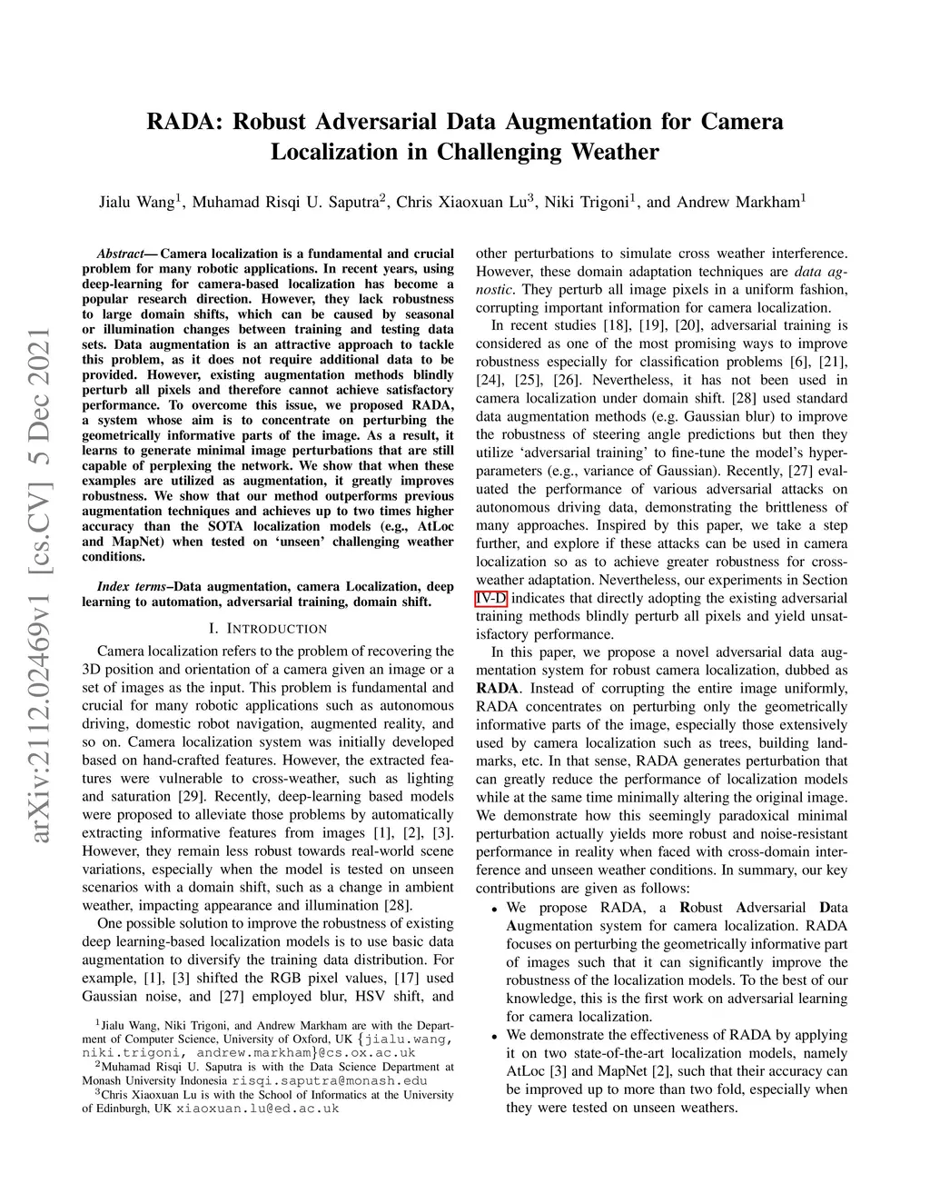 Camera localization is a fundamental and crucial problem for many robotic applications. In recent years, using deep-learning for camera-based localization has become a popular research direction. However, they lack robustness to large domain shifts, which can be caused by seasonal or illumination changes between training and testing data sets. Data augmentation is an attractive approach to tackle this problem, as it does not require additional data to be provided. However, existing augmentation methods blindly perturb all pixels and therefore cannot achieve satisfactory performance. To overcome this issue, we proposed RADA, a system whose aim is to concentrate on perturbing the geometrically informative parts of the image. As a result, it learns to generate minimal image perturbations that are still capable of perplexing the network. We show that when these examples are utilized as augmentation, it greatly improves robustness. We show that our method outperforms previous augmentation techniques and achieves up to two times higher accuracy than the SOTA localization models (e.g., AtLoc and MapNet) when tested on `unseen' challenging weather conditions.