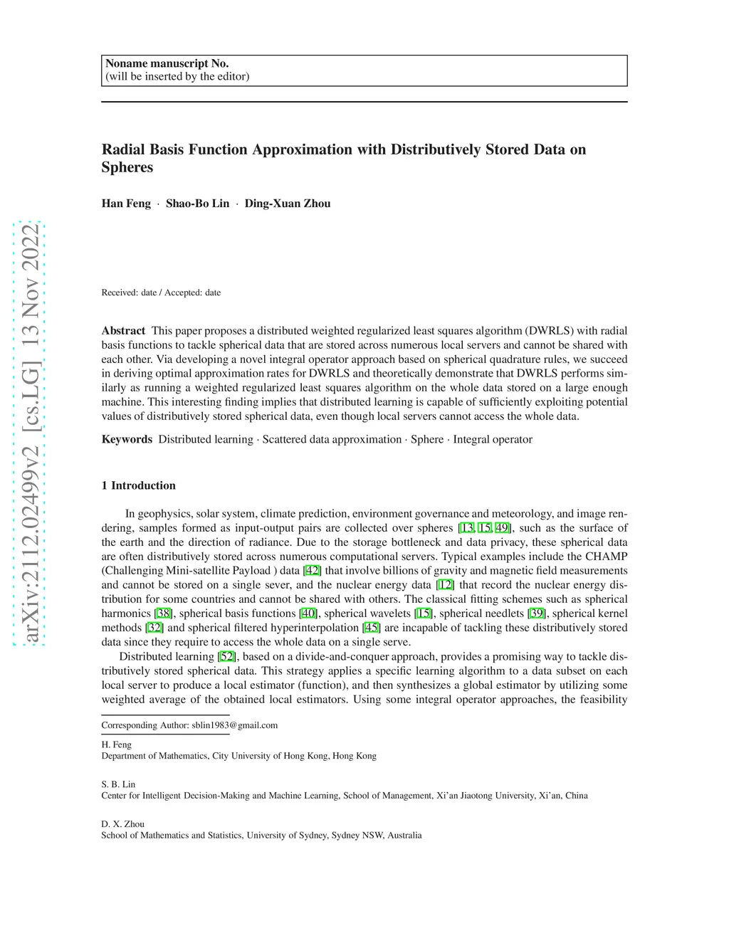 This paper proposes a distributed weighted regularized least squares algorithm (DWRLS) based on spherical radial basis functions and spherical quadrature rules to tackle spherical data that are stored across numerous local servers and cannot be shared with each other. Via developing a novel integral operator approach, we succeed in deriving optimal approximation rates for DWRLS and theoretically demonstrate that DWRLS performs similarly as running a weighted regularized least squares algorithm with the whole data on a large enough machine. This interesting finding implies that distributed learning is capable of sufficiently exploiting potential values of distributively stored spherical data, even though every local server cannot access all the data.