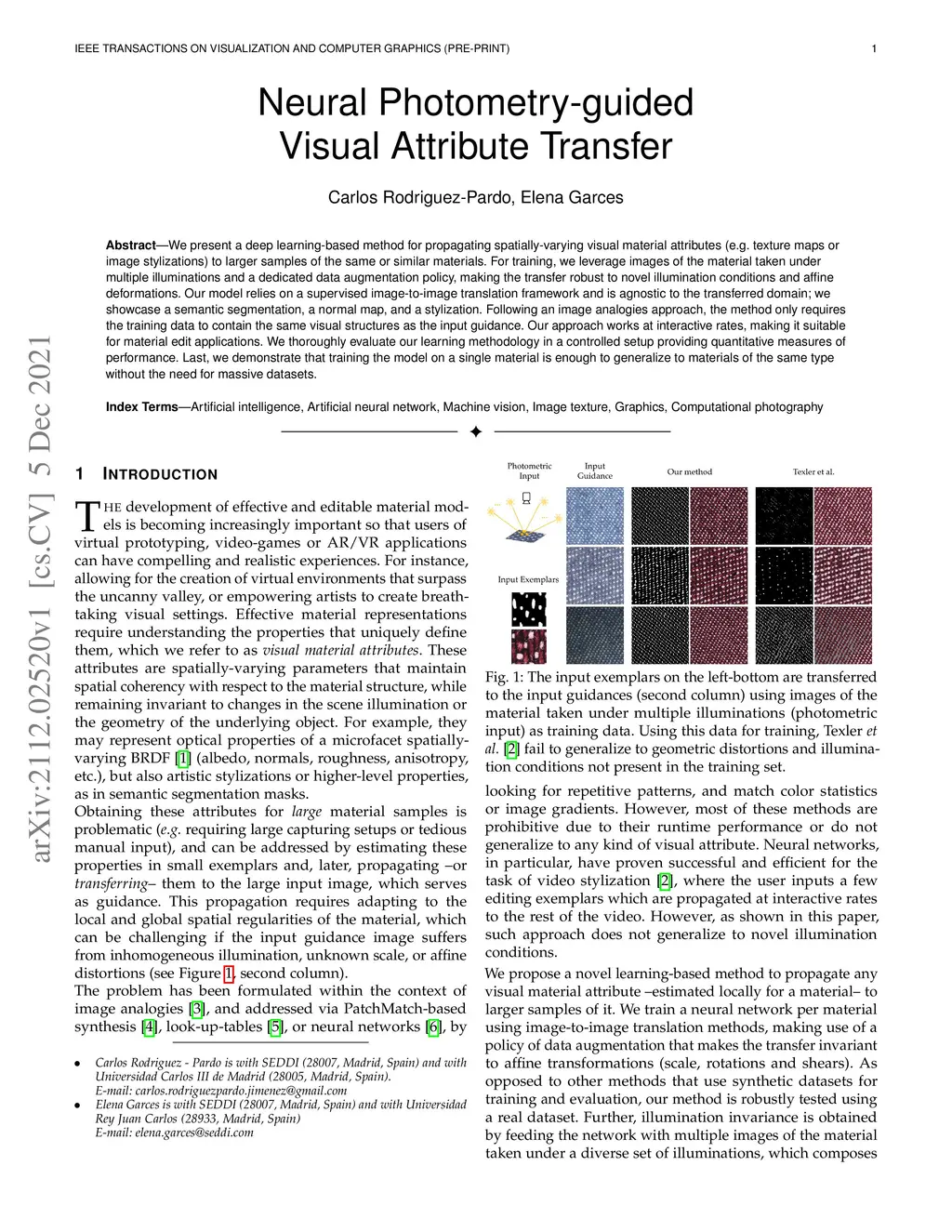 We present a deep learning-based method for propagating spatially-varying visual material attributes (e.g. texture maps or image stylizations) to larger samples of the same or similar materials. For training, we leverage images of the material taken under multiple illuminations and a dedicated data augmentation policy, making the transfer robust to novel illumination conditions and affine deformations. Our model relies on a supervised image-to-image translation framework and is agnostic to the transferred domain; we showcase a semantic segmentation, a normal map, and a stylization. Following an image analogies approach, the method only requires the training data to contain the same visual structures as the input guidance. Our approach works at interactive rates, making it suitable for material edit applications. We thoroughly evaluate our learning methodology in a controlled setup providing quantitative measures of performance. Last, we demonstrate that training the model on a single material is enough to generalize to materials of the same type without the need for massive datasets.