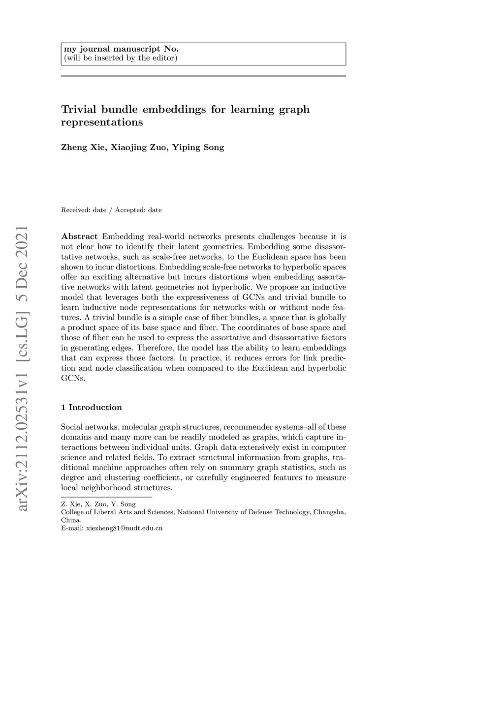 Embedding real-world networks presents challenges because it is not clear how to identify their latent geometries. Embedding some disassortative networks, such as scale-free networks, to the Euclidean space has been shown to incur distortions. Embedding scale-free networks to hyperbolic spaces offer an exciting alternative but incurs distortions when embedding assortative networks with latent geometries not hyperbolic. We propose an inductive model that leverages both the expressiveness of GCNs and trivial bundle to learn inductive node representations for networks with or without node features. A trivial bundle is a simple case of fiber bundles,a space that is globally a product space of its base space and fiber. The coordinates of base space and those of fiber can be used to express the assortative and disassortative factors in generating edges. Therefore, the model has the ability to learn embeddings that can express those factors. In practice, it reduces errors for link prediction and node classification when compared to the Euclidean and hyperbolic GCNs.