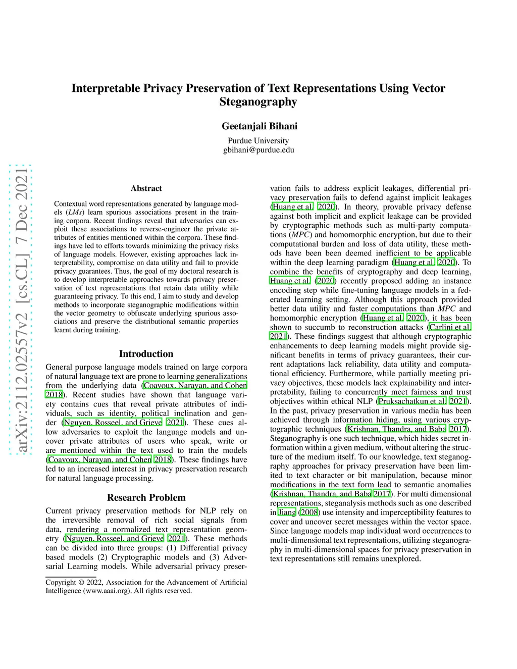 Contextual word representations generated by language models (LMs) learn spurious associations present in the training corpora. Recent findings reveal that adversaries can exploit these associations to reverse-engineer the private attributes of entities mentioned within the corpora. These findings have led to efforts towards minimizing the privacy risks of language models. However, existing approaches lack interpretability, compromise on data utility and fail to provide privacy guarantees. Thus, the goal of my doctoral research is to develop interpretable approaches towards privacy preservation of text representations that retain data utility while guaranteeing privacy. To this end, I aim to study and develop methods to incorporate steganographic modifications within the vector geometry to obfuscate underlying spurious associations and preserve the distributional semantic properties learnt during training.