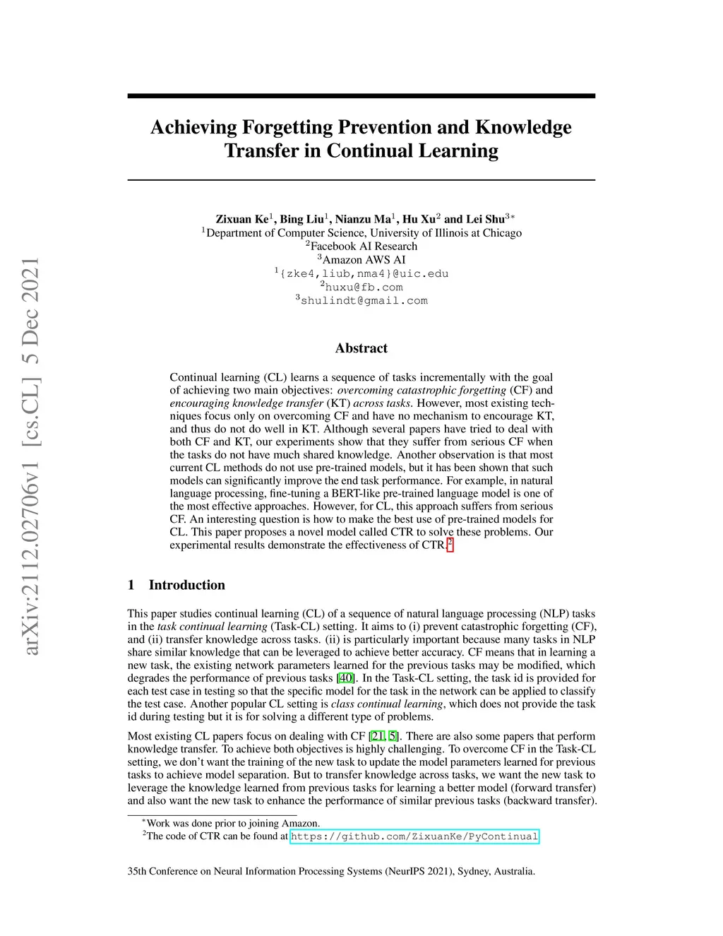 Continual learning (CL) learns a sequence of tasks incrementally with the goal of achieving two main objectives: overcoming catastrophic forgetting (CF) and encouraging knowledge transfer (KT) across tasks. However, most existing techniques focus only on overcoming CF and have no mechanism to encourage KT, and thus do not do well in KT. Although several papers have tried to deal with both CF and KT, our experiments show that they suffer from serious CF when the tasks do not have much shared knowledge. Another observation is that most current CL methods do not use pre-trained models, but it has been shown that such models can significantly improve the end task performance. For example, in natural language processing, fine-tuning a BERT-like pre-trained language model is one of the most effective approaches. However, for CL, this approach suffers from serious CF. An interesting question is how to make the best use of pre-trained models for CL. This paper proposes a novel model called CTR to solve these problems. Our experimental results demonstrate the effectiveness of CTR