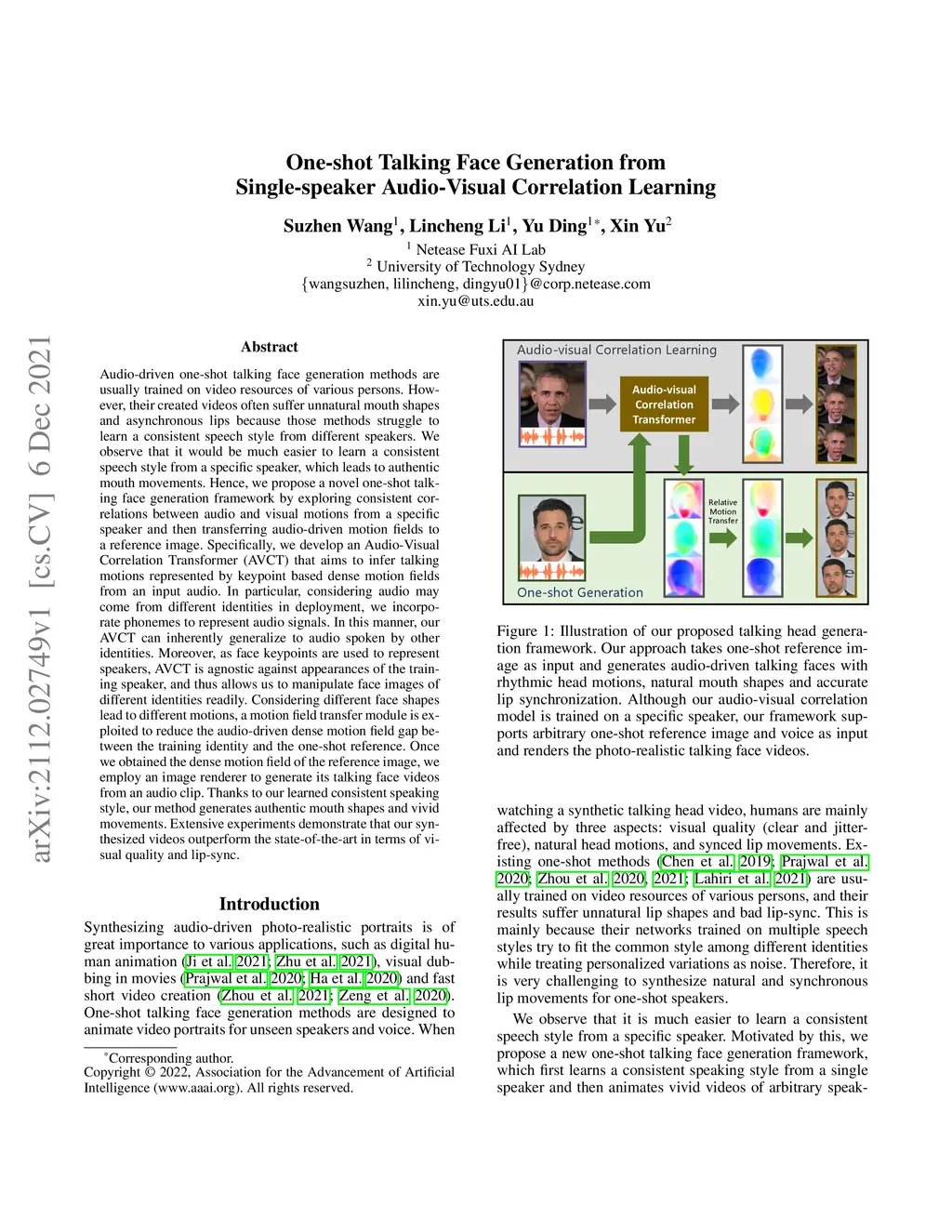 Audio-driven one-shot talking face generation methods are usually trained on video resources of various persons. However, their created videos often suffer unnatural mouth shapes and asynchronous lips because those methods struggle to learn a consistent speech style from different speakers. We observe that it would be much easier to learn a consistent speech style from a specific speaker, which leads to authentic mouth movements. Hence, we propose a novel one-shot talking face generation framework by exploring consistent correlations between audio and visual motions from a specific speaker and then transferring audio-driven motion fields to a reference image. Specifically, we develop an Audio-Visual Correlation Transformer (AVCT) that aims to infer talking motions represented by keypoint based dense motion fields from an input audio. In particular, considering audio may come from different identities in deployment, we incorporate phonemes to represent audio signals. In this manner, our AVCT can inherently generalize to audio spoken by other identities. Moreover, as face keypoints are used to represent speakers, AVCT is agnostic against appearances of the training speaker, and thus allows us to manipulate face images of different identities readily. Considering different face shapes lead to different motions, a motion field transfer module is exploited to reduce the audio-driven dense motion field gap between the training identity and the one-shot reference. Once we obtained the dense motion field of the reference image, we employ an image renderer to generate its talking face videos from an audio clip. Thanks to our learned consistent speaking style, our method generates authentic mouth shapes and vivid movements. Extensive experiments demonstrate that our synthesized videos outperform the state-of-the-art in terms of visual quality and lip-sync.