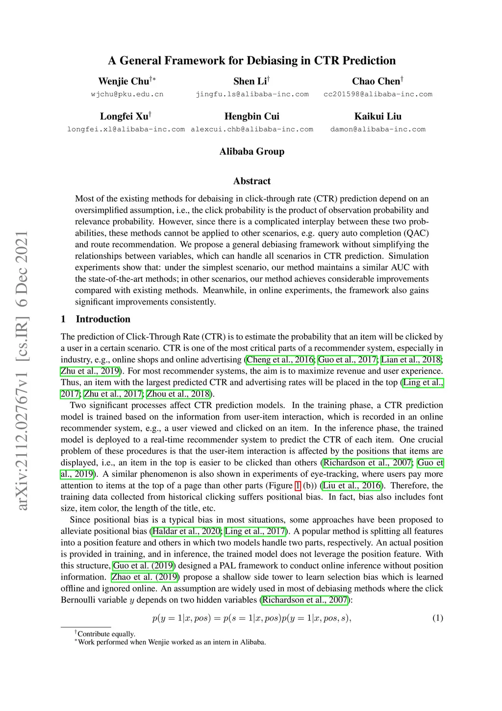 Most of the existing methods for debaising in click-through rate (CTR) prediction depend on an oversimplified assumption, i.e., the click probability is the product of observation probability and relevance probability. However, since there is a complicated interplay between these two probabilities, these methods cannot be applied to other scenarios, e.g. query auto completion (QAC) and route recommendation. We propose a general debiasing framework without simplifying the relationships between variables, which can handle all scenarios in CTR prediction. Simulation experiments show that: under the simplest scenario, our method maintains a similar AUC with the state-of-the-art methods; in other scenarios, our method achieves considerable improvements compared with existing methods. Meanwhile, in online experiments, the framework also gains significant improvements consistently.