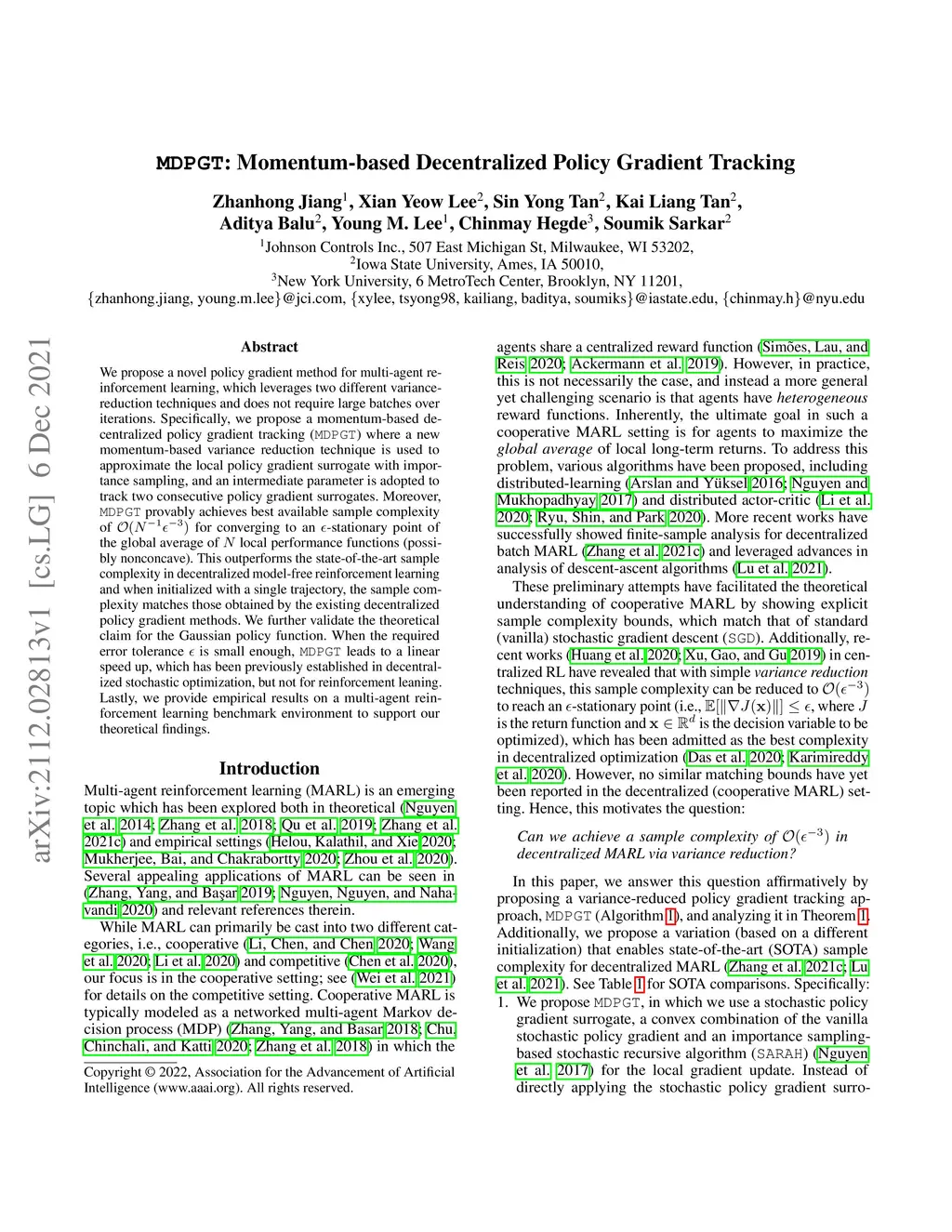 We propose a novel policy gradient method for multi-agent reinforcement learning, which leverages two different variance-reduction techniques and does not require large batches over iterations. Specifically, we propose a momentum-based decentralized policy gradient tracking (MDPGT) where a new momentum-based variance reduction technique is used to approximate the local policy gradient surrogate with importance sampling, and an intermediate parameter is adopted to track two consecutive policy gradient surrogates. Moreover, MDPGT provably achieves the best available sample complexity of for converging to an -stationary point of the global average of local performance functions (possibly nonconcave). This outperforms the state-of-the-art sample complexity in decentralized model-free reinforcement learning, and when initialized with a single trajectory, the sample complexity matches those obtained by the existing decentralized policy gradient methods. We further validate the theoretical claim for the Gaussian policy function. When the required error tolerance is small enough, MDPGT leads to a linear speed up, which has been previously established in decentralized stochastic optimization, but not for reinforcement learning. Lastly, we provide empirical results on a multi-agent reinforcement learning benchmark environment to support our theoretical findings.