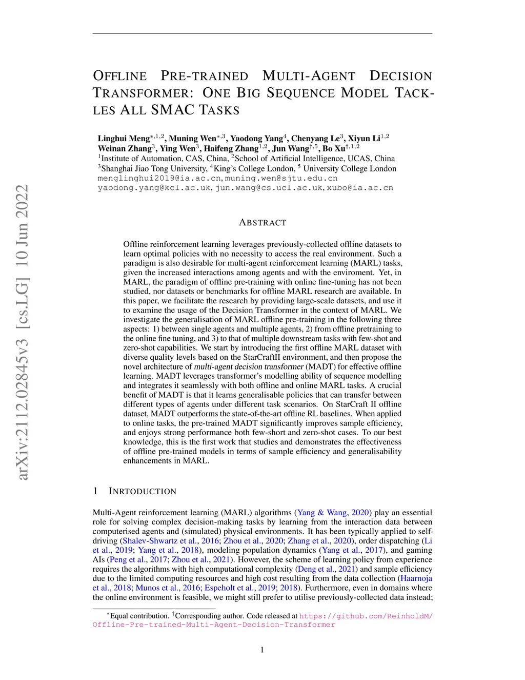 Offline reinforcement learning leverages static datasets to learn optimal policies with no necessity to access the environment. This technique is desirable for multi-agent learning tasks due to the expensiveness of agents' online interactions and the demanding number of samples during training. Yet, in multi-agent reinforcement learning (MARL), the paradigm of offline pre-training with online fine-tuning has never been studied, nor datasets or benchmarks for offline MARL research are available. In this paper, we try to answer the question of whether offline pre-training in MARL is able to learn generalisable policy representations that can help improve the performance of multiple downstream tasks. We start by introducing the first offline MARL dataset with diverse quality levels based on the StarCraftII environment, and then propose the novel architecture of multi-agent decision transformer (MADT) for effective offline learning. MADT leverages Transformer's modelling ability of temporal representations and integrates it with both offline and online MARL tasks. A crucial benefit of MADT is that it learns generalisable policies that can transfer between different types of agents under different task scenarios. When evaluated on StarCraft II offline dataset, MADT demonstrates superior performance than state-of-the-art offline RL baselines. When applied to online tasks, the pre-trained MADT significantly improves sample efficiency, and enjoys strong performance even in zero-shot cases. To our best knowledge, this is the first work that studies and demonstrates the effectiveness of offline pre-trained models in terms of sample efficiency and generalisability enhancements in MARL.