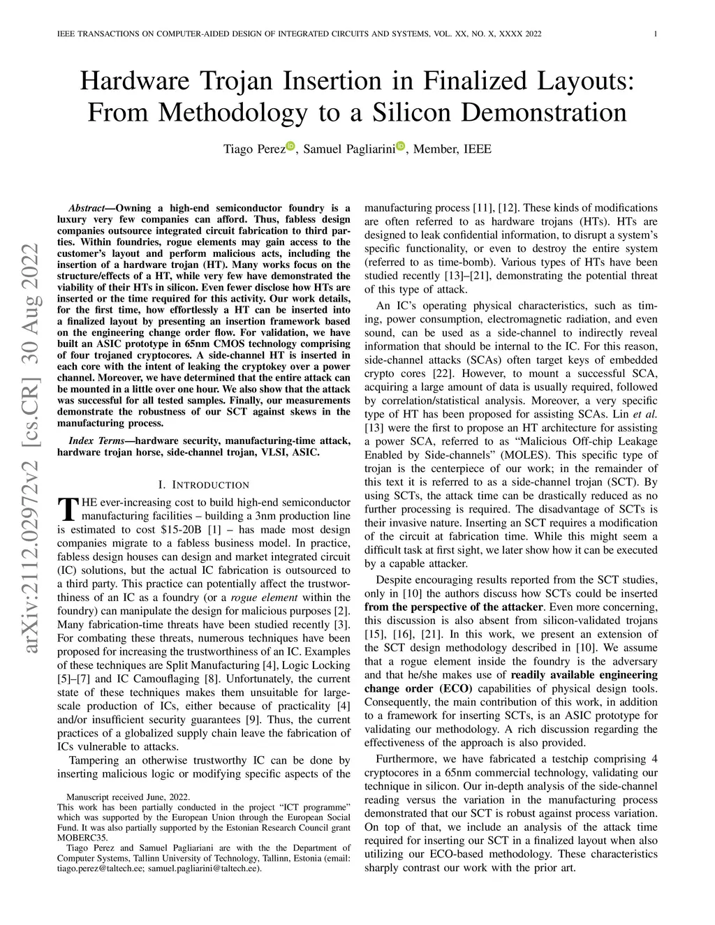 Owning a high-end semiconductor foundry is a luxury very few companies can afford. Thus, fabless design companies outsource integrated circuit fabrication to third parties. Within foundries, rogue elements may gain access to the customer's layout and perform malicious acts, including the insertion of a hardware trojan (HT). Many works focus on the structure/effects of a HT, while very few have demonstrated the viability of their HTs in silicon. Even fewer disclose how HTs are inserted or the time required for this activity. Our work details, for the first time, how effortlessly a HT can be inserted into a finalized layout by presenting an insertion framework based on the engineering change order flow. For validation, we have built an ASIC prototype in 65nm CMOS technology comprising of four trojaned cryptocores. A side-channel HT is inserted in each core with the intent of leaking the cryptokey over a power channel. Moreover, we have determined that the entire attack can be mounted in a little over one hour. We also show that the attack was successful for all tested samples. Finally, our measurements demonstrate the robustness of our SCT against skews in the manufacturing process.