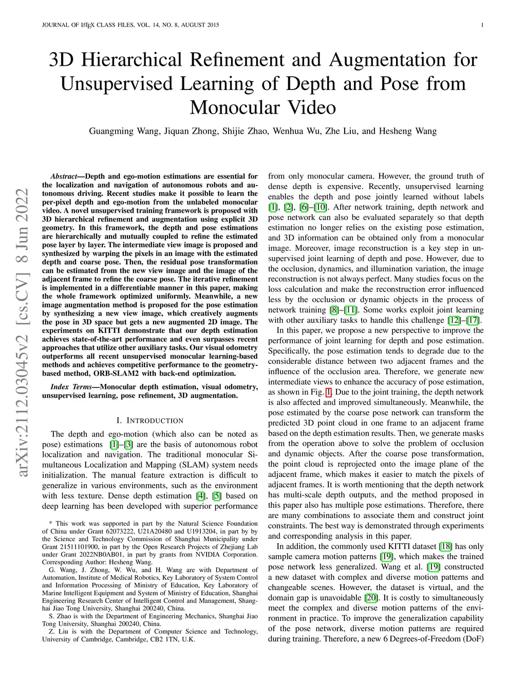 Depth and ego-motion estimations are essential for the localization and navigation of autonomous robots and autonomous driving. Recent studies make it possible to learn the per-pixel depth and ego-motion from the unlabeled monocular video. A novel unsupervised training framework is proposed with 3D hierarchical refinement and augmentation using explicit 3D geometry. In this framework, the depth and pose estimations are hierarchically and mutually coupled to refine the estimated pose layer by layer. The intermediate view image is proposed and synthesized by warping the pixels in an image with the estimated depth and coarse pose. Then, the residual pose transformation can be estimated from the new view image and the image of the adjacent frame to refine the coarse pose. The iterative refinement is implemented in a differentiable manner in this paper, making the whole framework optimized uniformly. Meanwhile, a new image augmentation method is proposed for the pose estimation by synthesizing a new view image, which creatively augments the pose in 3D space but gets a new augmented 2D image. The experiments on KITTI demonstrate that our depth estimation achieves state-of-the-art performance and even surpasses recent approaches that utilize other auxiliary tasks. Our visual odometry outperforms all recent unsupervised monocular learning-based methods and achieves competitive performance to the geometry-based method, ORB-SLAM2 with back-end optimization.