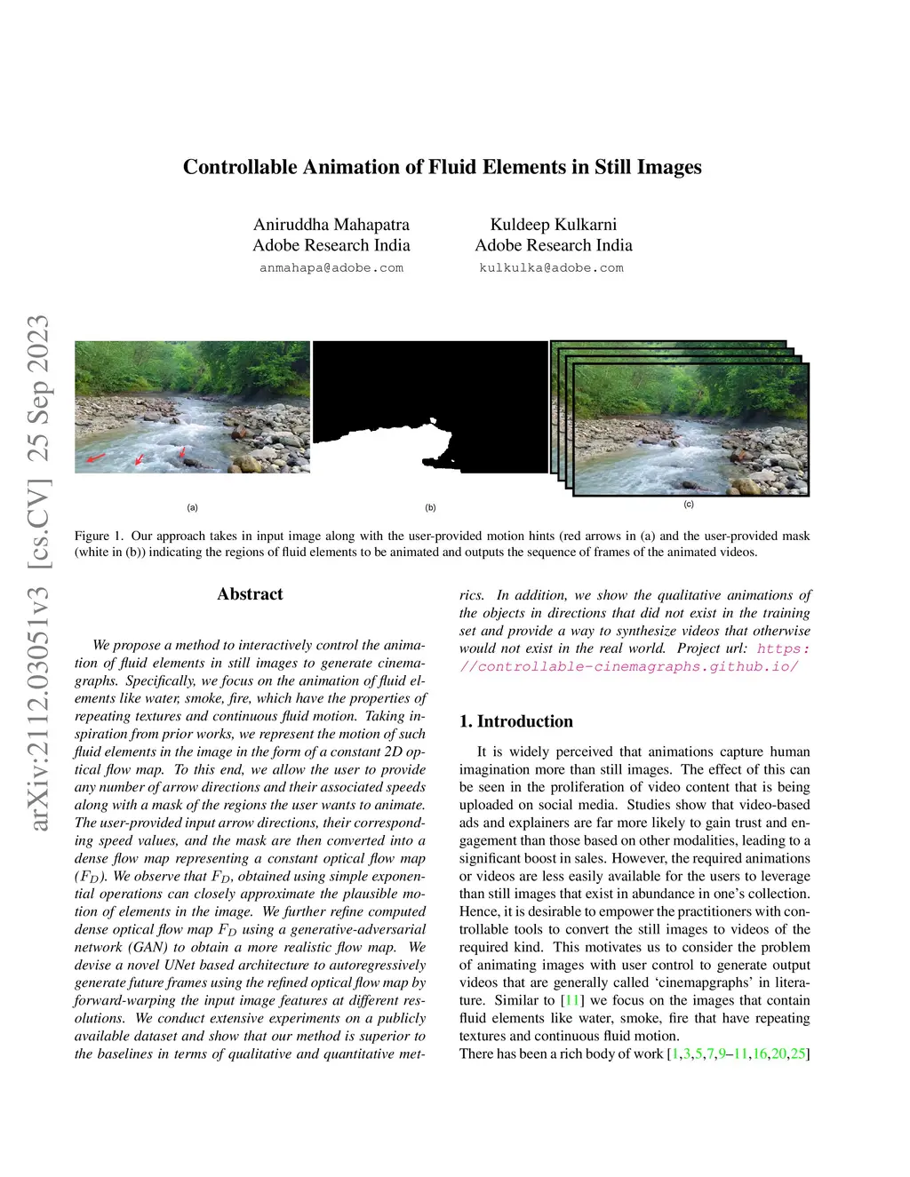 We propose a method to interactively control the animation of fluid elements in still images to generate cinemagraphs. Specifically, we focus on the animation of fluid elements like water, smoke, fire, which have the properties of repeating textures and continuous fluid motion. Taking inspiration from prior works, we represent the motion of such fluid elements in the image in the form of a constant 2D optical flow map. To this end, we allow the user to provide any number of arrow directions and their associated speeds along with a mask of the regions the user wants to animate. The user-provided input arrow directions, their corresponding speed values, and the mask are then converted into a dense flow map representing a constant optical flow map (FD). We observe that FD, obtained using simple exponential operations can closely approximate the plausible motion of elements in the image. We further refine computed dense optical flow map FD using a generative-adversarial network (GAN) to obtain a more realistic flow map. We devise a novel UNet based architecture to autoregressively generate future frames using the refined optical flow map by forward-warping the input image features at different resolutions. We conduct extensive experiments on a publicly available dataset and show that our method is superior to the baselines in terms of qualitative and quantitative metrics. In addition, we show the qualitative animations of the objects in directions that did not exist in the training set and provide a way to synthesize videos that otherwise would not exist in the real world.