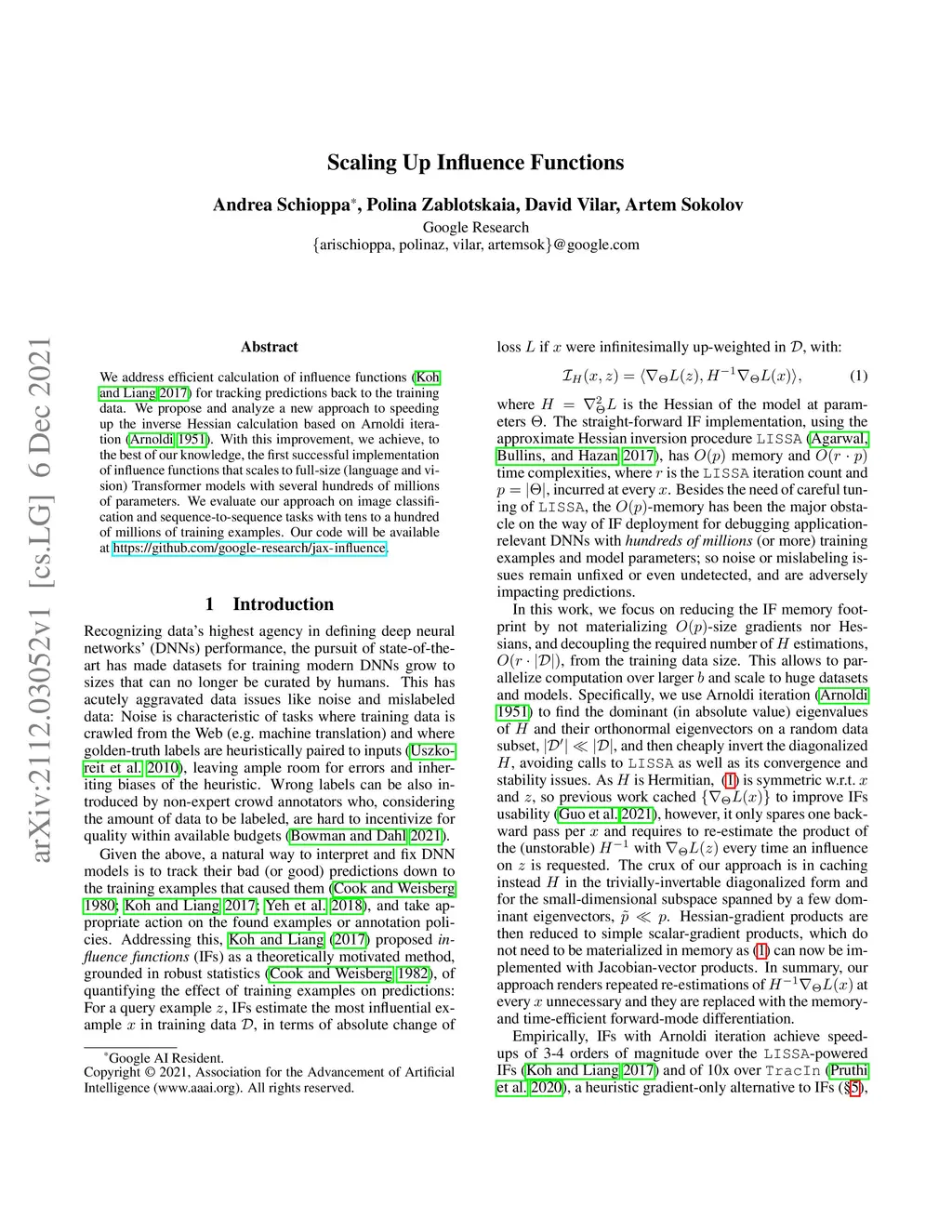 We address efficient calculation of influence functions for tracking predictions back to the training data. We propose and analyze a new approach to speeding up the inverse Hessian calculation based on Arnoldi iteration. With this improvement, we achieve, to the best of our knowledge, the first successful implementation of influence functions that scales to full-size (language and vision) Transformer models with several hundreds of millions of parameters. We evaluate our approach on image classification and sequence-to-sequence tasks with tens to a hundred of millions of training examples. Our code will be available at https://github.com/google-research/jax-influence.