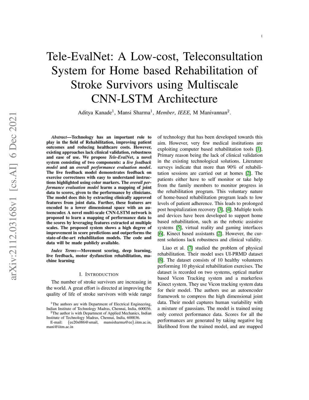 Technology has an important role to play in the field of Rehabilitation, improving patient outcomes and reducing healthcare costs. However, existing approaches lack clinical validation, robustness and ease of use. We propose Tele-EvalNet, a novel system consisting of two components: a live feedback model and an overall performance evaluation model. The live feedback model demonstrates feedback on exercise correctness with easy to understand instructions highlighted using color markers. The overall performance evaluation model learns a mapping of joint data to scores, given to the performance by clinicians. The model does this by extracting clinically approved features from joint data. Further, these features are encoded to a lower dimensional space with an autoencoder. A novel multi-scale CNN-LSTM network is proposed to learn a mapping of performance data to the scores by leveraging features extracted at multiple scales. The proposed system shows a high degree of improvement in score predictions and outperforms the state-of-the-art rehabilitation models.