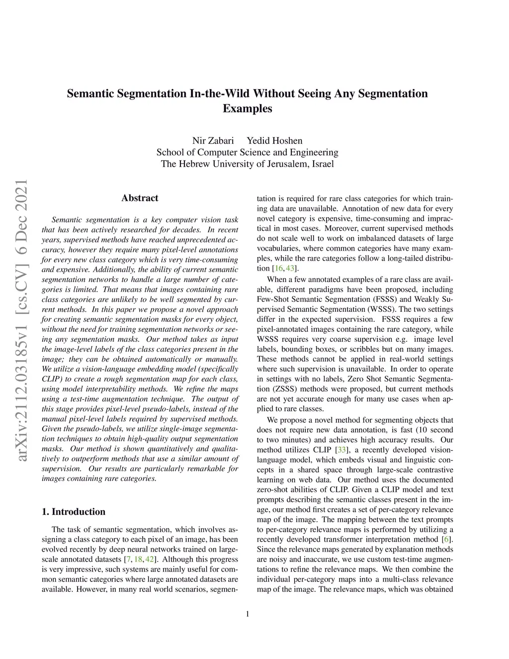 Semantic segmentation is a key computer vision task that has been actively researched for decades. In recent years, supervised methods have reached unprecedented accuracy, however they require many pixel-level annotations for every new class category which is very time-consuming and expensive. Additionally, the ability of current semantic segmentation networks to handle a large number of categories is limited. That means that images containing rare class categories are unlikely to be well segmented by current methods. In this paper we propose a novel approach for creating semantic segmentation masks for every object, without the need for training segmentation networks or seeing any segmentation masks. Our method takes as input the image-level labels of the class categories present in the image; they can be obtained automatically or manually. We utilize a vision-language embedding model (specifically CLIP) to create a rough segmentation map for each class, using model interpretability methods. We refine the maps using a test-time augmentation technique. The output of this stage provides pixel-level pseudo-labels, instead of the manual pixel-level labels required by supervised methods. Given the pseudo-labels, we utilize single-image segmentation techniques to obtain high-quality output segmentation masks. Our method is shown quantitatively and qualitatively to outperform methods that use a similar amount of supervision. Our results are particularly remarkable for images containing rare categories.