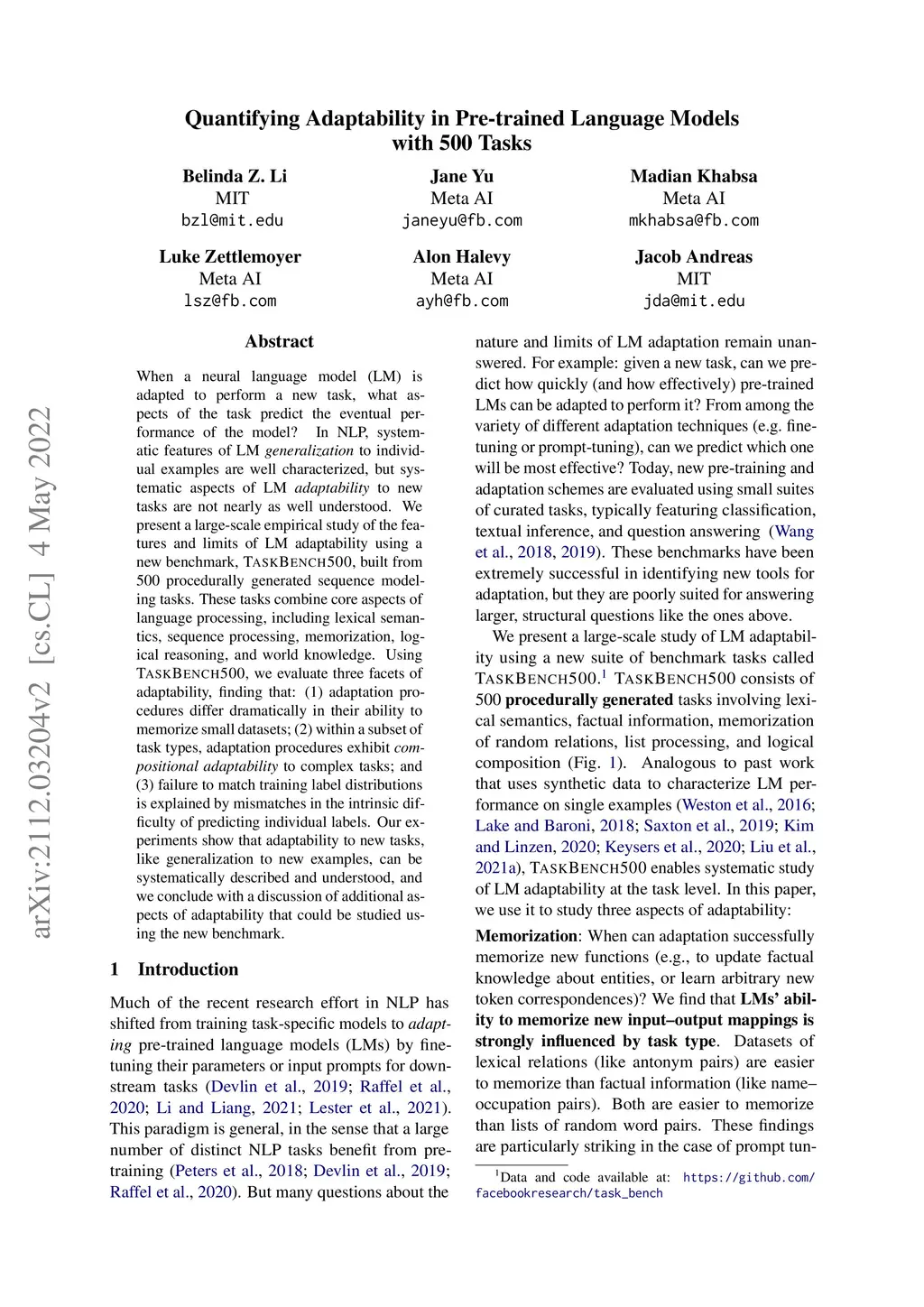 When a neural language model (LM) is adapted to perform a new task, what aspects of the task predict the eventual performance of the model? In NLP, systematic features of LM generalization to individual examples are well characterized, but systematic aspects of LM adaptability to new tasks are not nearly as well understood. We present a large-scale empirical study of the features and limits of LM adaptability using a new benchmark, TaskBench500, built from 500 procedurally generated sequence modeling tasks. These tasks combine core aspects of language processing, including lexical semantics, sequence processing, memorization, logical reasoning, and world knowledge. Using TaskBench500, we evaluate three facets of adaptability, finding that: (1) adaptation procedures differ dramatically in their ability to memorize small datasets; (2) within a subset of task types, adaptation procedures exhibit compositional adaptability to complex tasks; and (3) failure to match training label distributions is explained by mismatches in the intrinsic difficulty of predicting individual labels. Our experiments show that adaptability to new tasks, like generalization to new examples, can be systematically described and understood, and we conclude with a discussion of additional aspects of adaptability that could be studied using the new benchmark.