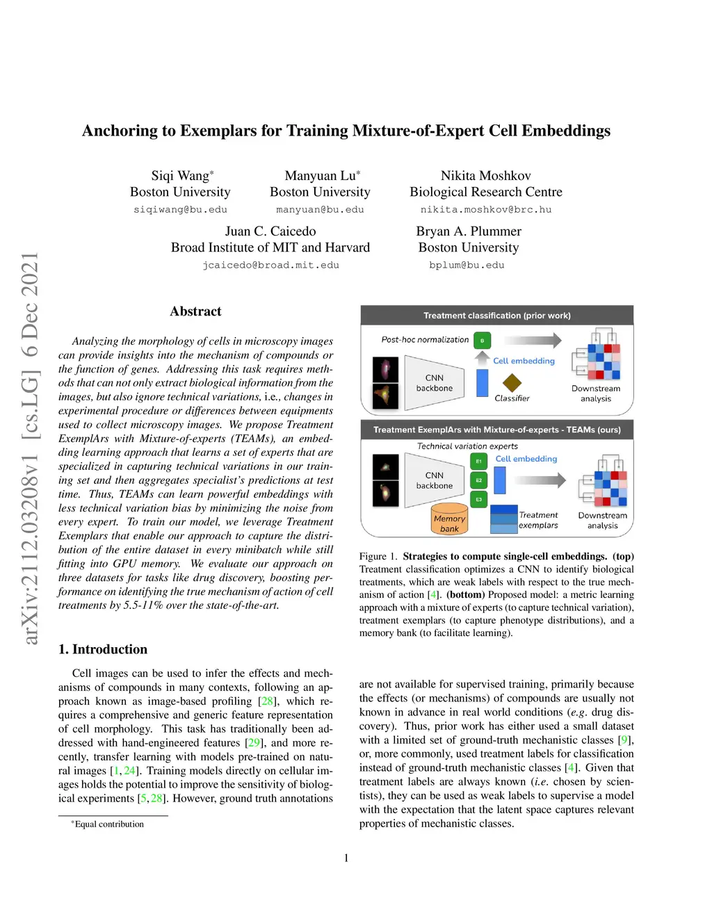 Analyzing the morphology of cells in microscopy images can provide insights into the mechanism of compounds or the function of genes. Addressing this task requires methods that can not only extract biological information from the images, but also ignore technical variations, ie, changes in experimental procedure or differences between equipments used to collect microscopy images. We propose Treatment ExemplArs with Mixture-of-experts (TEAMs), an embedding learning approach that learns a set of experts that are specialized in capturing technical variations in our training set and then aggregates specialist's predictions at test time. Thus, TEAMs can learn powerful embeddings with less technical variation bias by minimizing the noise from every expert. To train our model, we leverage Treatment Exemplars that enable our approach to capture the distribution of the entire dataset in every minibatch while still fitting into GPU memory. We evaluate our approach on three datasets for tasks like drug discovery, boosting performance on identifying the true mechanism of action of cell treatments by 5.5-11% over the state-of-the-art.