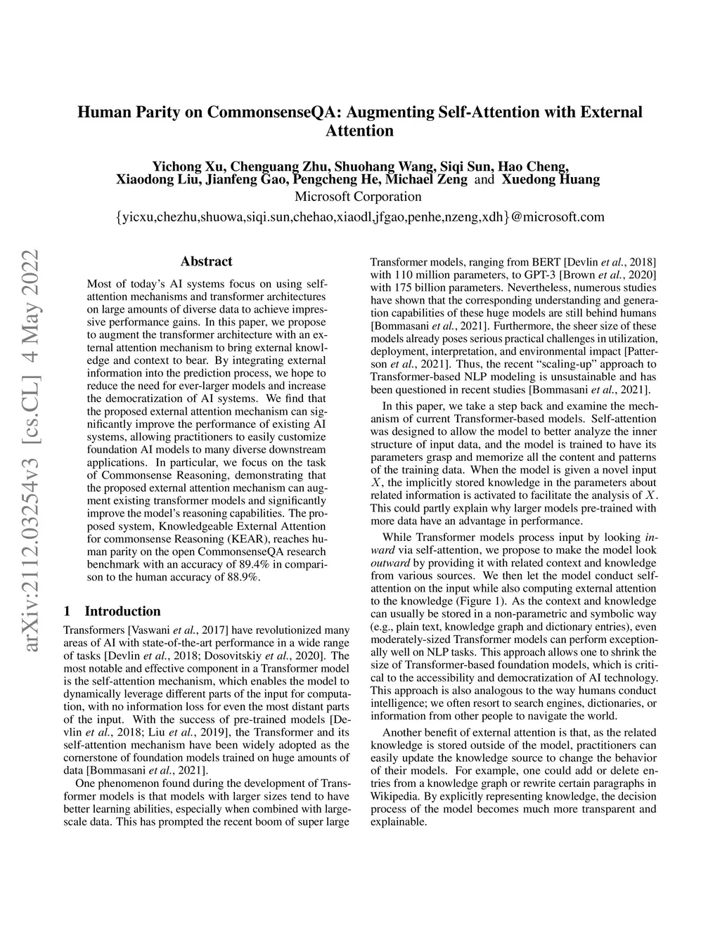 Most of today's AI systems focus on using self-attention mechanisms and transformer architectures on large amounts of diverse data to achieve impressive performance gains. In this paper, we propose to augment the transformer architecture with an external attention mechanism to bring external knowledge and context to bear. By integrating external information into the prediction process, we hope to reduce the need for ever-larger models and increase the democratization of AI systems. We find that the proposed external attention mechanism can significantly improve the performance of existing AI systems, allowing practitioners to easily customize foundation AI models to many diverse downstream applications. In particular, we focus on the task of Commonsense Reasoning, demonstrating that the proposed external attention mechanism can augment existing transformer models and significantly improve the model's reasoning capabilities. The proposed system, Knowledgeable External Attention for commonsense Reasoning (KEAR), reaches human parity on the open CommonsenseQA research benchmark with an accuracy of 89.4\% in comparison to the human accuracy of 88.9\%.