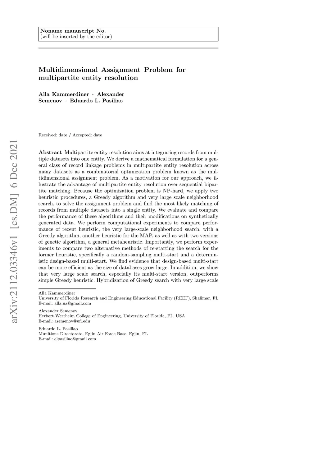 Multipartite entity resolution aims at integrating records from multiple datasets into one entity. We derive a mathematical formulation for a general class of record linkage problems in multipartite entity resolution across many datasets as a combinatorial optimization problem known as the multidimensional assignment problem. As a motivation for our approach, we illustrate the advantage of multipartite entity resolution over sequential bipartite matching. Because the optimization problem is NP-hard, we apply two heuristic procedures, a Greedy algorithm and very large scale neighborhood search, to solve the assignment problem and find the most likely matching of records from multiple datasets into a single entity. We evaluate and compare the performance of these algorithms and their modifications on synthetically generated data. We perform computational experiments to compare performance of recent heuristic, the very large-scale neighborhood search, with a Greedy algorithm, another heuristic for the MAP, as well as with two versions of genetic algorithm, a general metaheuristic. Importantly, we perform experiments to compare two alternative methods of re-starting the search for the former heuristic, specifically a random-sampling multi-start and a deterministic design-based multi-start. We find evidence that design-based multi-start can be more efficient as the size of databases grow large. In addition, we show that very large scale search, especially its multi-start version, outperforms simple Greedy heuristic. Hybridization of Greedy search with very large scale neighborhood search improves the performance. Using multi-start with as few as three additional runs of very large scale search offers some improvement in the performance of the very large scale search procedure. Last, we propose an approach to evaluating complexity of the very large-scale neighborhood search.
