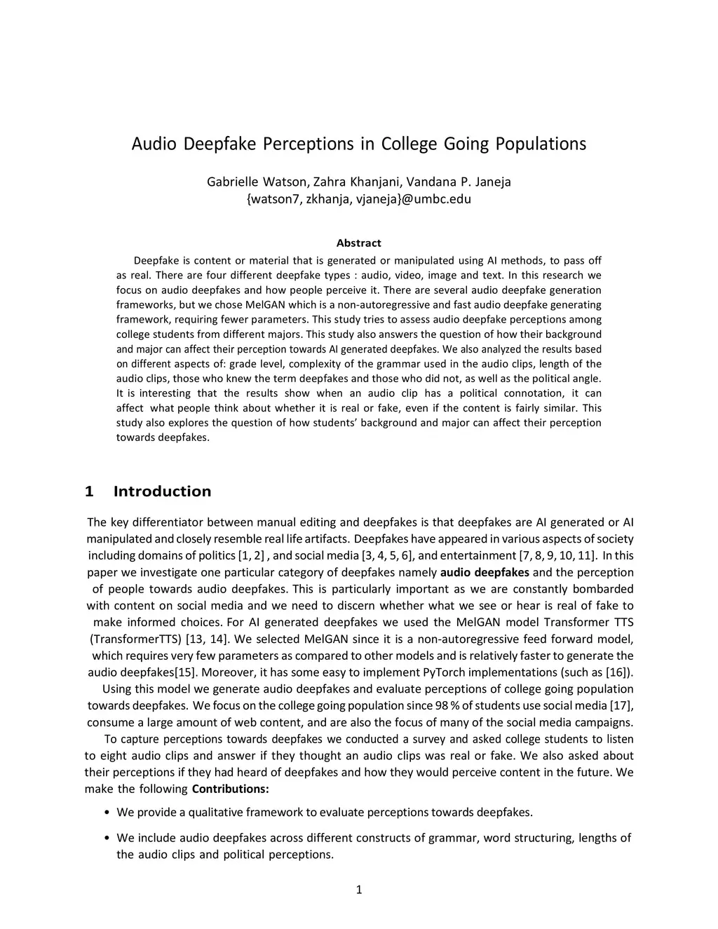 Deepfake is content or material that is generated or manipulated using AI methods, to pass off as real. There are four different deepfake types: audio, video, image and text. In this research we focus on audio deepfakes and how people perceive it. There are several audio deepfake generation frameworks, but we chose MelGAN which is a non-autoregressive and fast audio deepfake generating framework, requiring fewer parameters. This study tries to assess audio deepfake perceptions among college students from different majors. This study also answers the question of how their background and major can affect their perception towards AI generated deepfakes. We also analyzed the results based on different aspects of: grade level, complexity of the grammar used in the audio clips, length of the audio clips, those who knew the term deepfakes and those who did not, as well as the political angle. It is interesting that the results show when an audio clip has a political connotation, it can affect what people think about whether it is real or fake, even if the content is fairly similar. This study also explores the question of how background and major can affect perception towards deepfakes.
