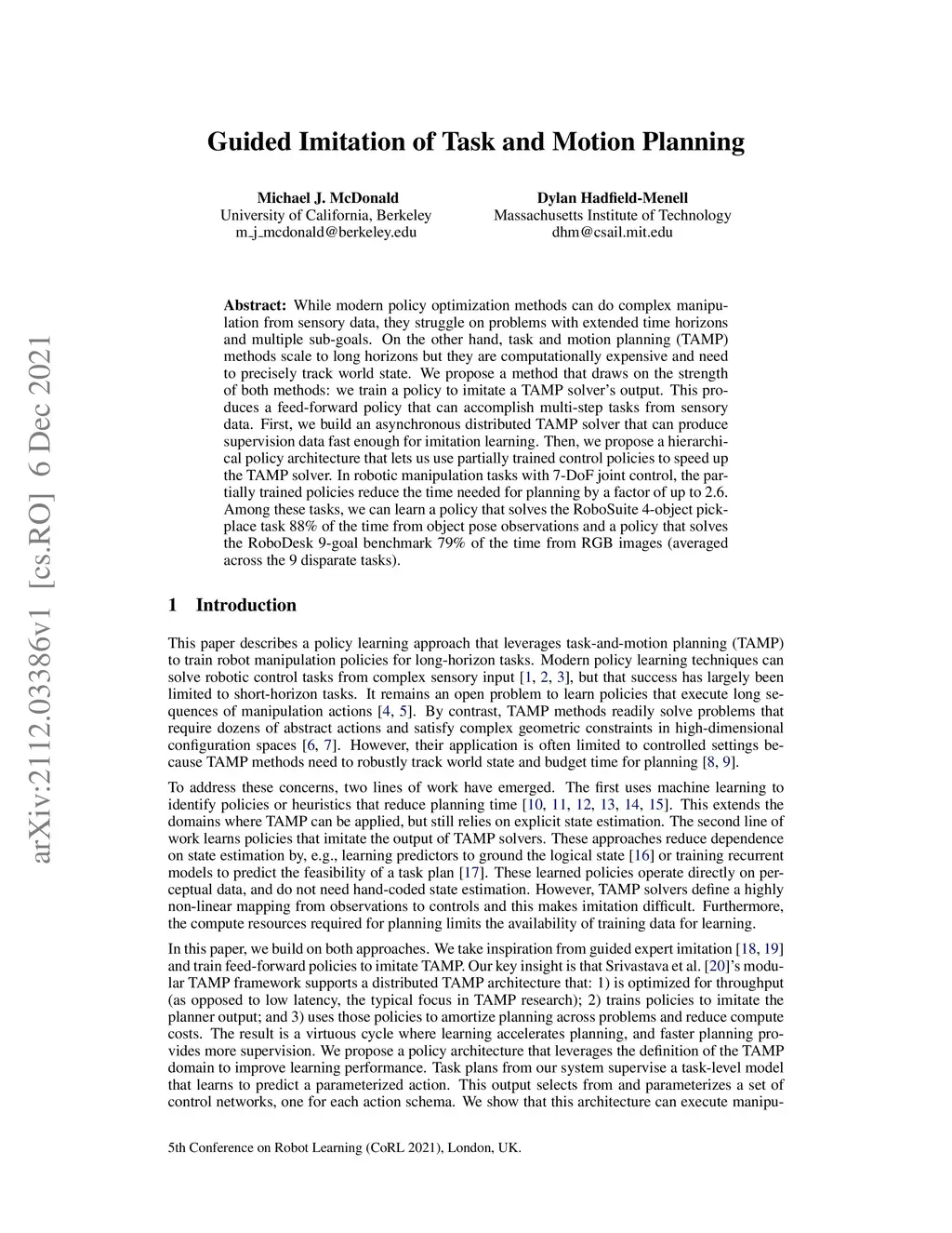 While modern policy optimization methods can do complex manipulation from sensory data, they struggle on problems with extended time horizons and multiple sub-goals. On the other hand, task and motion planning (TAMP) methods scale to long horizons but they are computationally expensive and need to precisely track world state. We propose a method that draws on the strength of both methods: we train a policy to imitate a TAMP solver's output. This produces a feed-forward policy that can accomplish multi-step tasks from sensory data. First, we build an asynchronous distributed TAMP solver that can produce supervision data fast enough for imitation learning. Then, we propose a hierarchical policy architecture that lets us use partially trained control policies to speed up the TAMP solver. In robotic manipulation tasks with 7-DoF joint control, the partially trained policies reduce the time needed for planning by a factor of up to 2.6. Among these tasks, we can learn a policy that solves the RoboSuite 4-object pick-place task 88% of the time from object pose observations and a policy that solves the RoboDesk 9-goal benchmark 79% of the time from RGB images (averaged across the 9 disparate tasks).